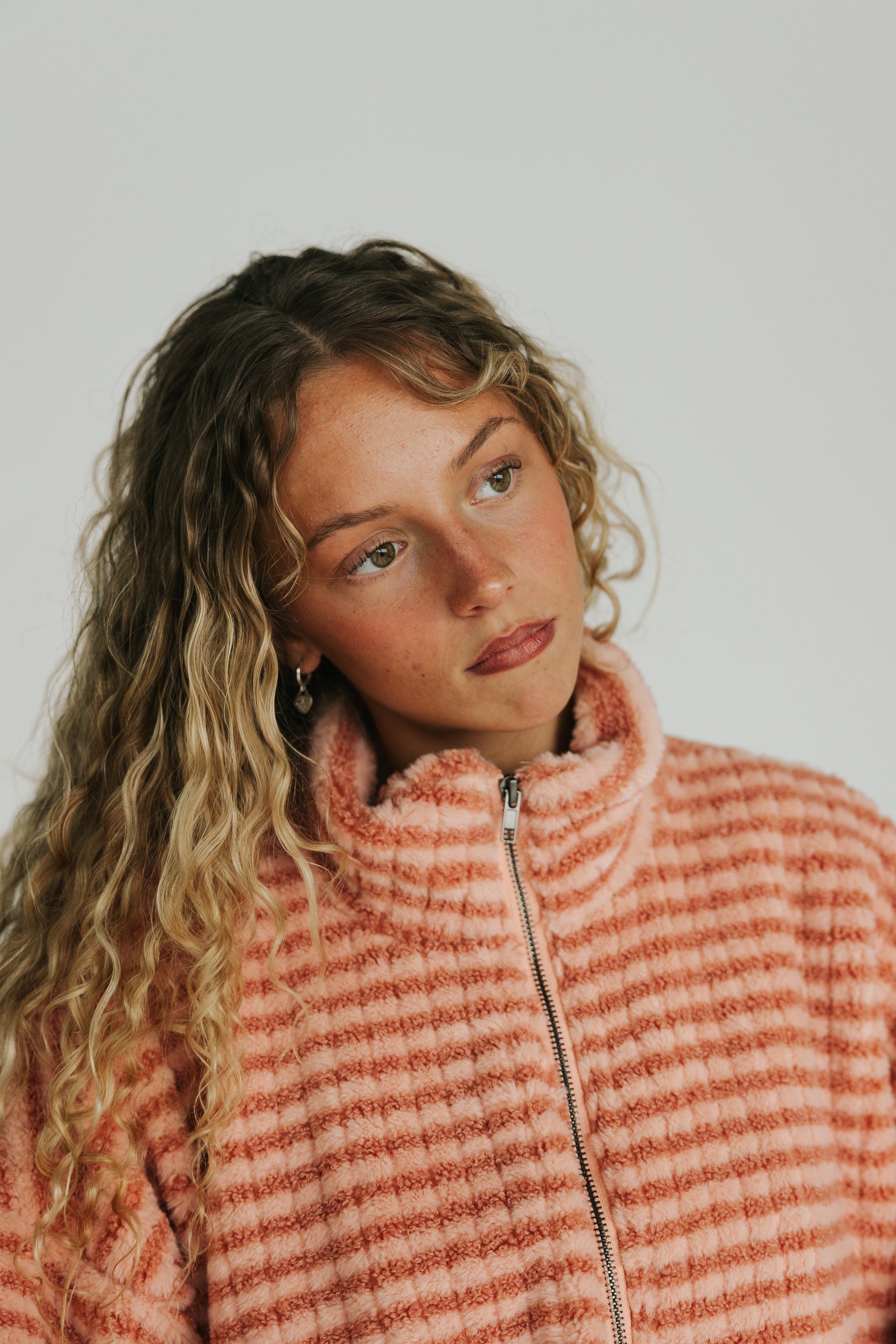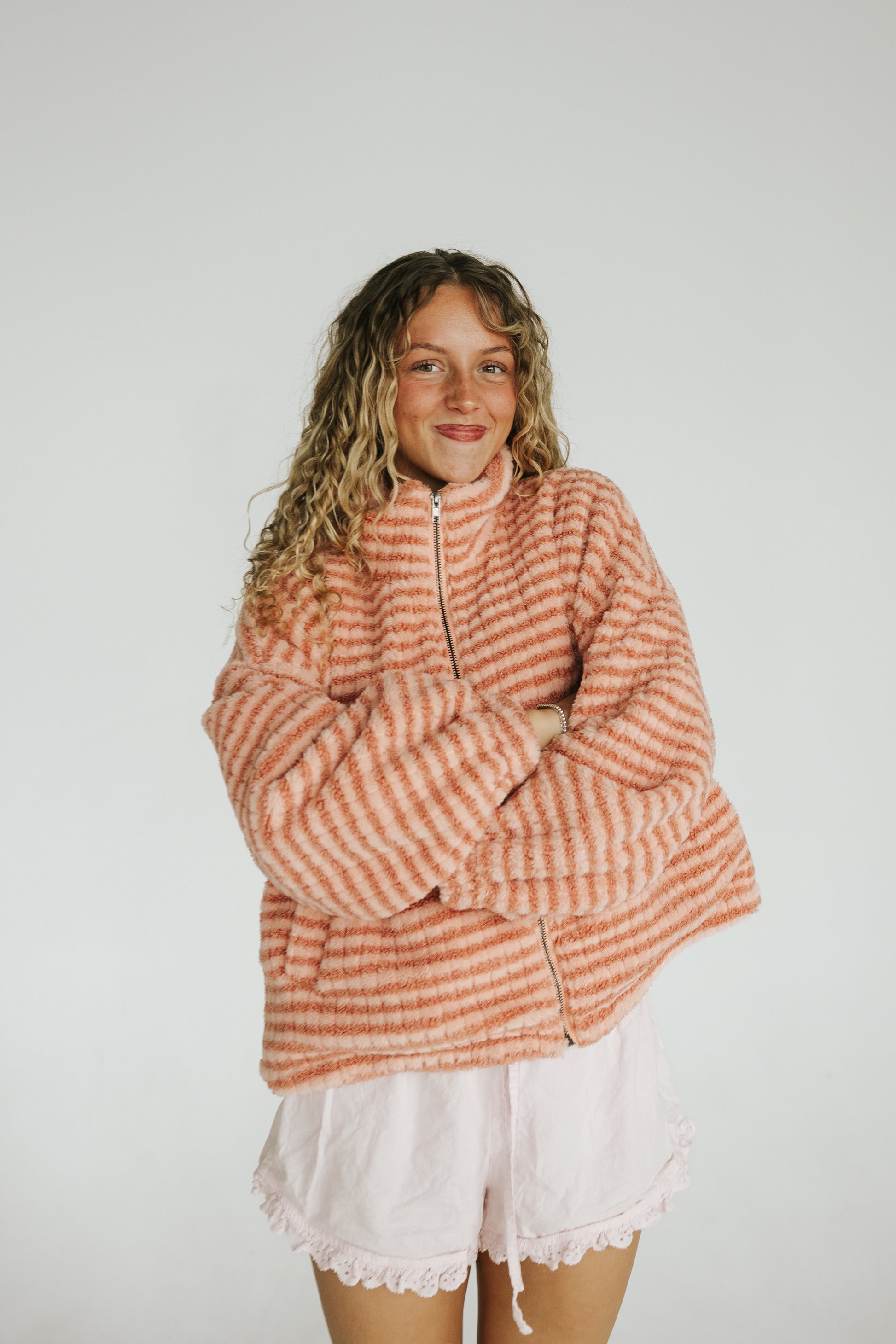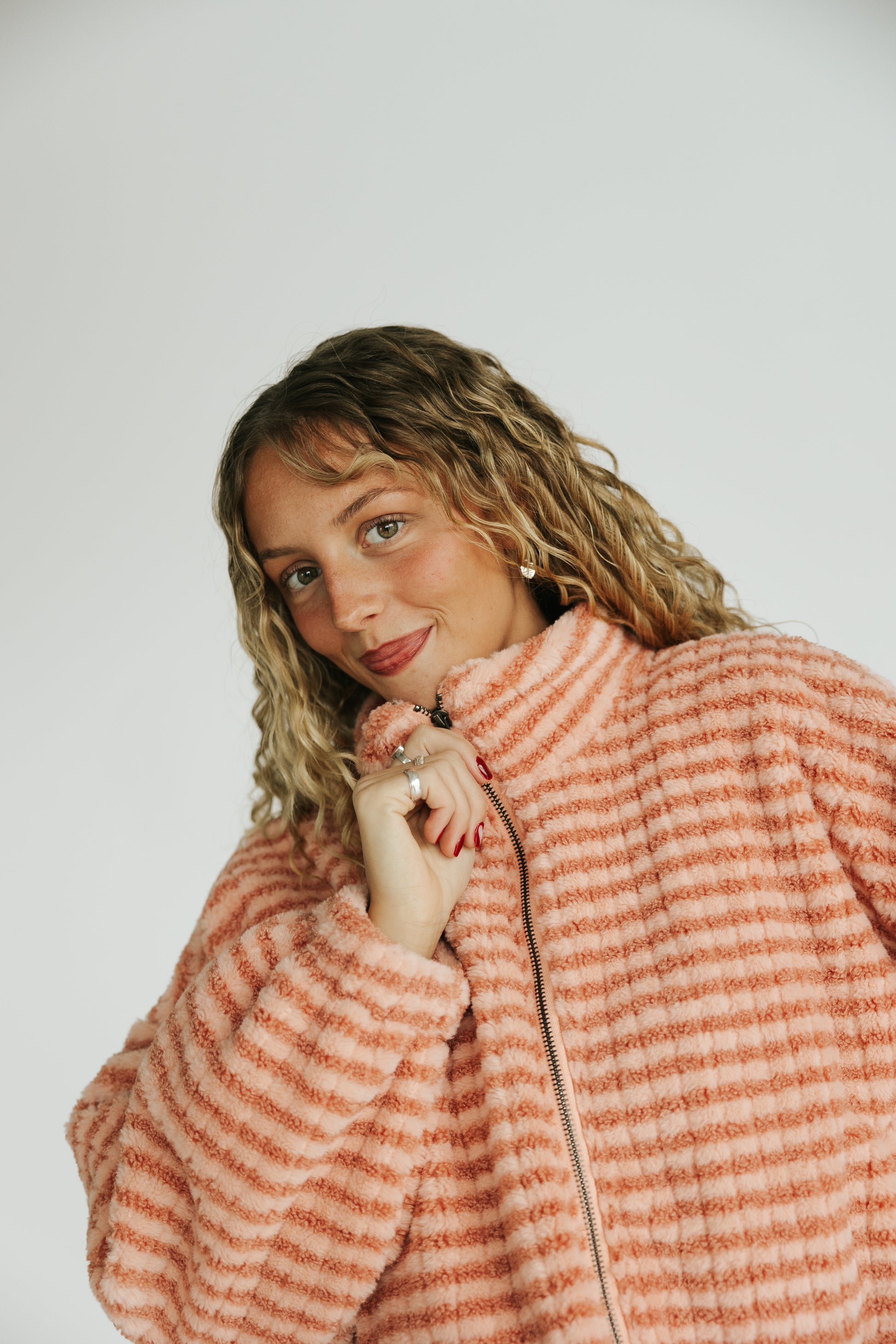 Our first ever fuzzy striped Sherpa, designed for ultimate comfort and a chic look. The soft, plush fabric offers a cozy feel, while the bold striped pattern adds a fun and fashionable twist. Featuring a sleek mock turtle neck that provides extra warmth, this zip-up jacket is perfect for layering. The full zipper makes it easy to adjust your fit, and the functional pockets add convenience for on-the-go storage. Whether you're running errands or relaxing at home, this Sherpa brings both warmth and style to your wardrobe!
