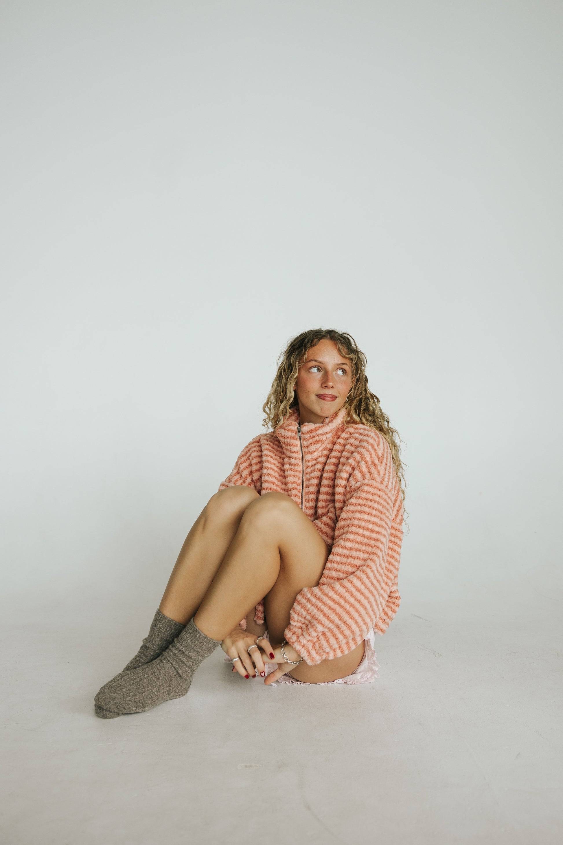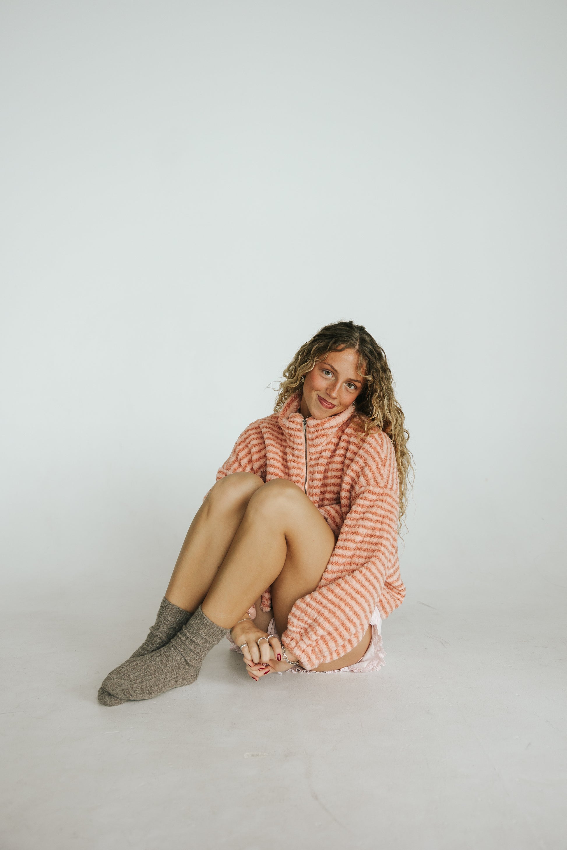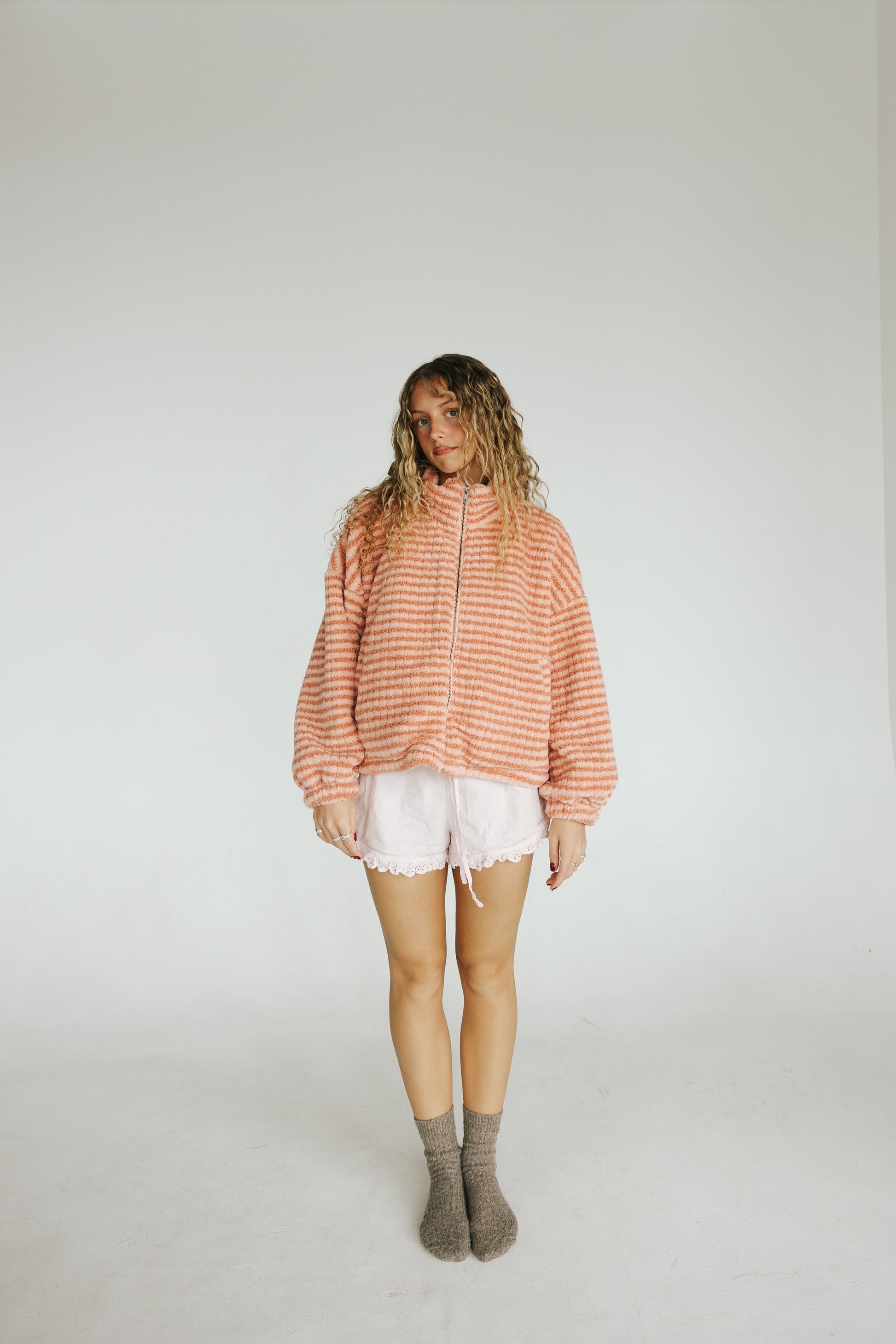 Our first ever fuzzy striped Sherpa, designed for ultimate comfort and a chic look. The soft, plush fabric offers a cozy feel, while the bold striped pattern adds a fun and fashionable twist. Featuring a sleek mock turtle neck that provides extra warmth, this zip-up jacket is perfect for layering. The full zipper makes it easy to adjust your fit, and the functional pockets add convenience for on-the-go storage. Whether you're running errands or relaxing at home, this Sherpa brings both warmth and style to your wardrobe!
