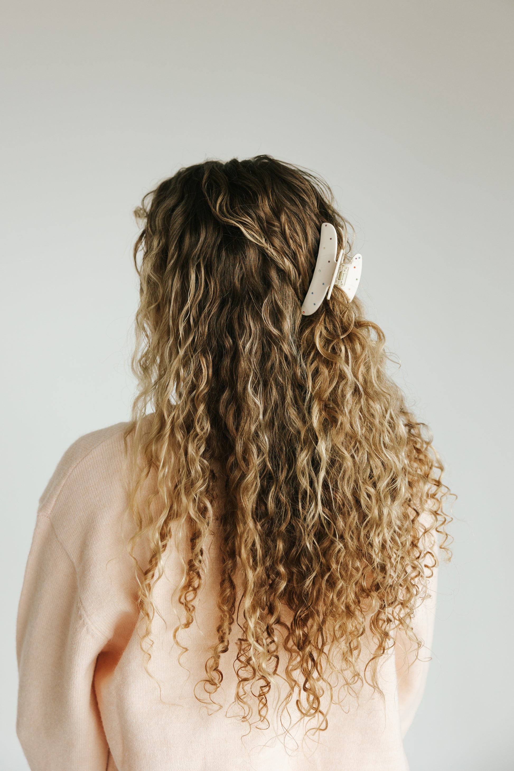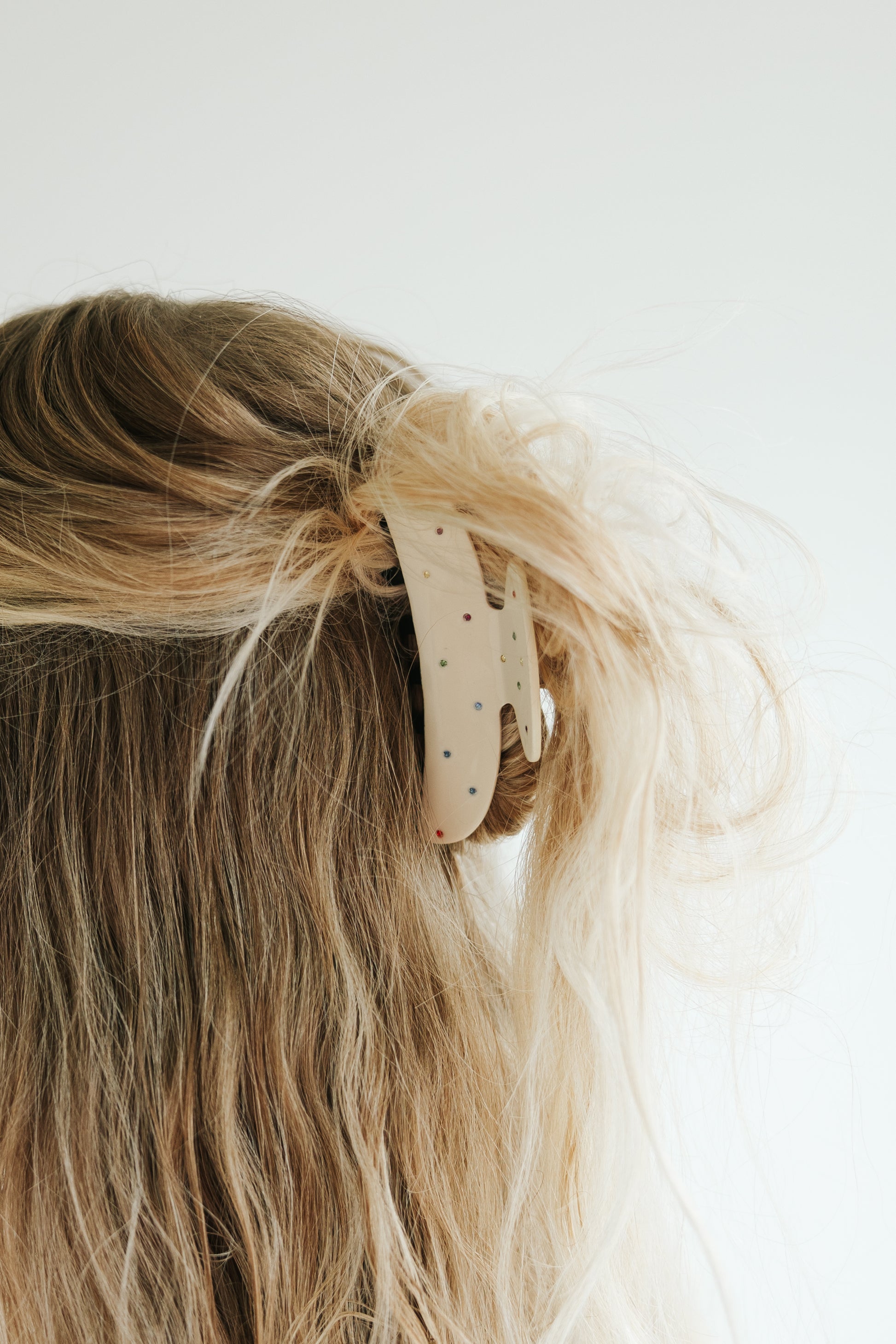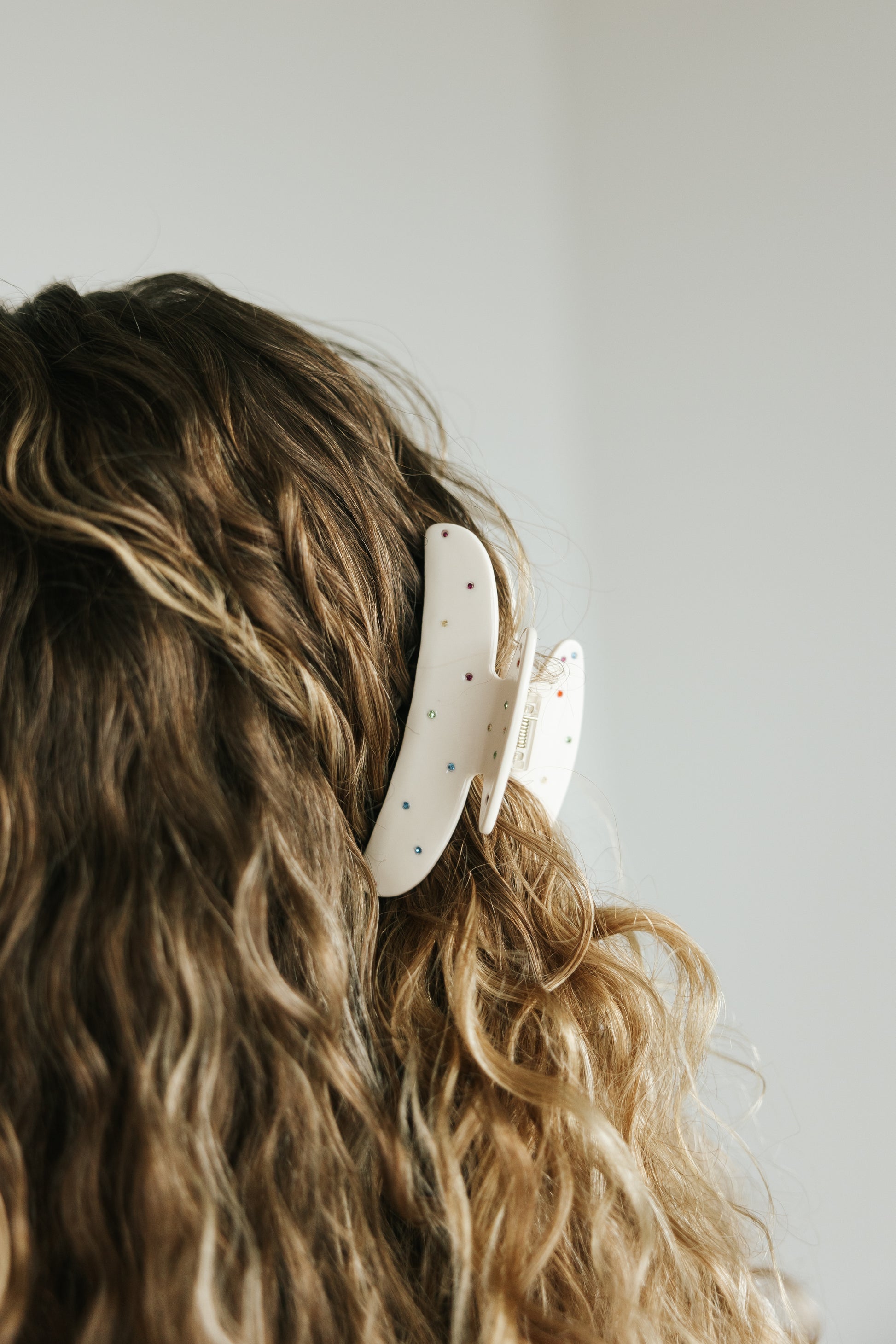 Add a touch of sparkle and fun to your hairstyle with our polka dot claw clip, featuring sparkling gems that catch the light with every turn. The classic polka dot design brings a playful, retro vibe, while the shimmering gems add a sophisticated twist. Perfect for securing your hair in style, this durable claw clip offers both functionality and flair, making it a must-have accessory for elevating any look, whether you're dressing up or keeping it casual!