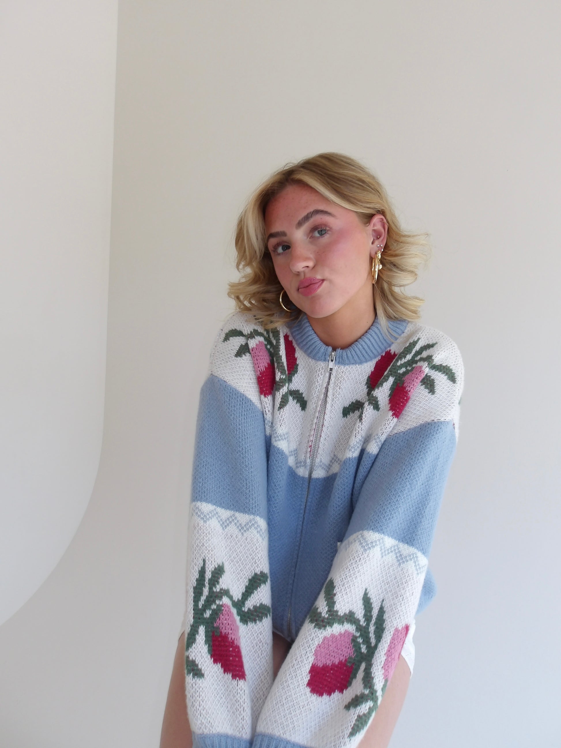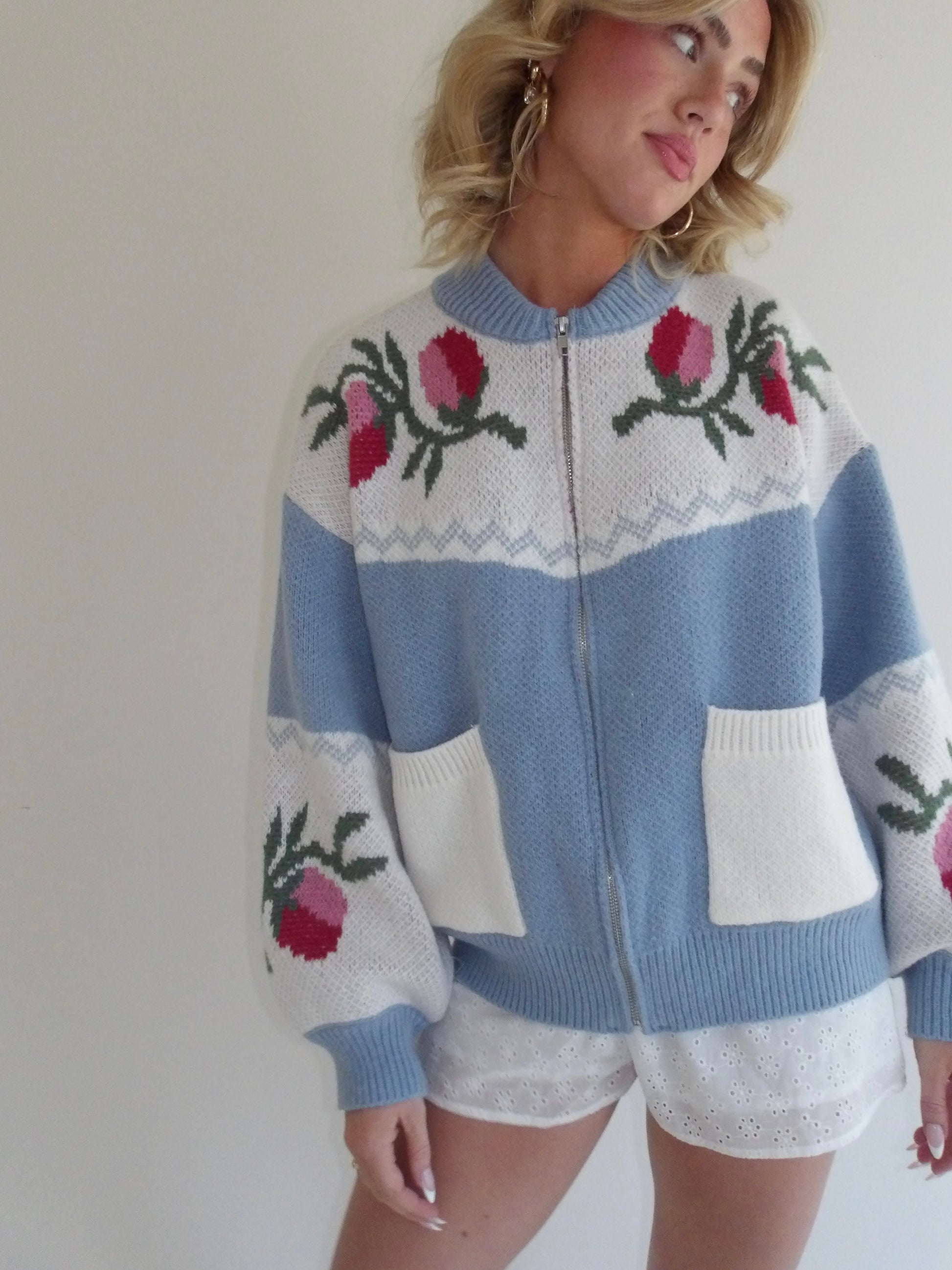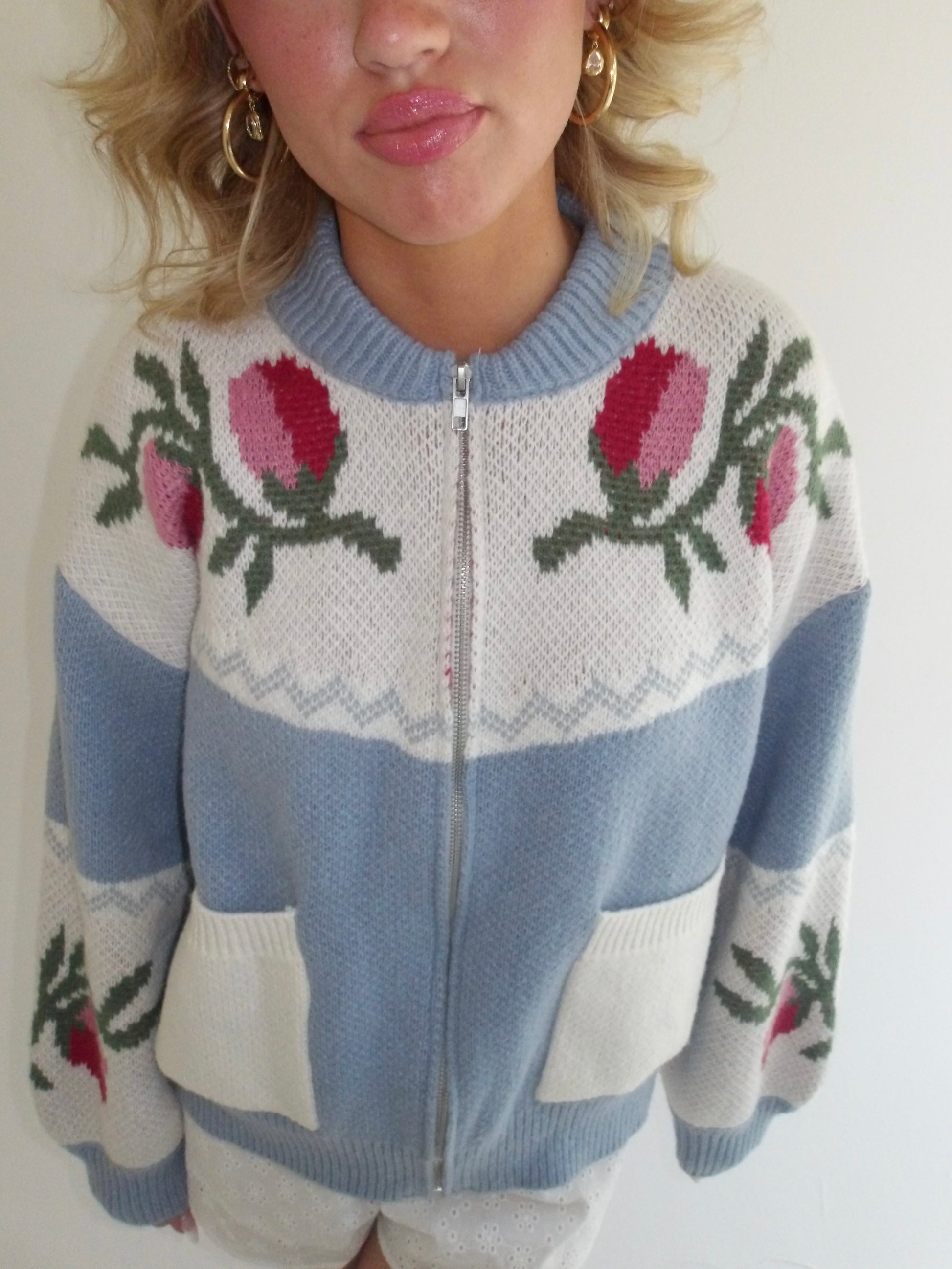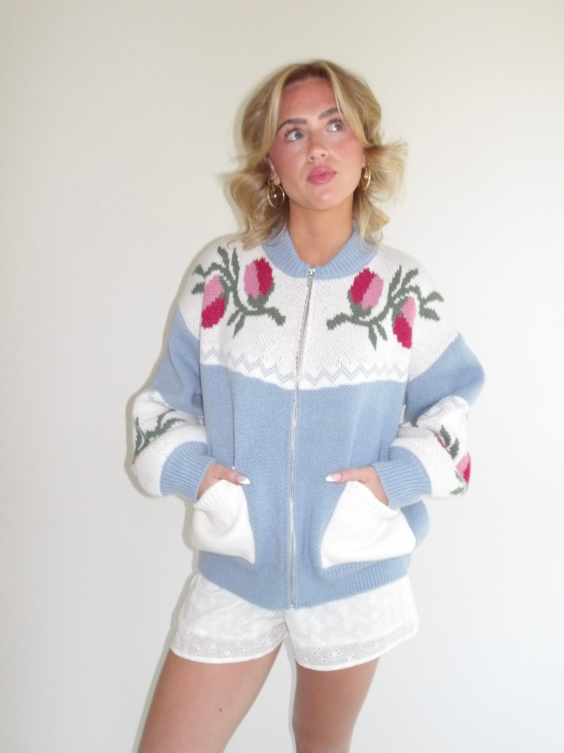 Your new favorite layer, The Riot Slouchy Girl now in Tulip. Has a vintage look with baby blue and white tones and a sweet tulip design. Made from ultra-soft fabric with a cozy feel, it features a relaxed fit, front zipper, and two handy pockets—perfect on a cozy spring day🌷