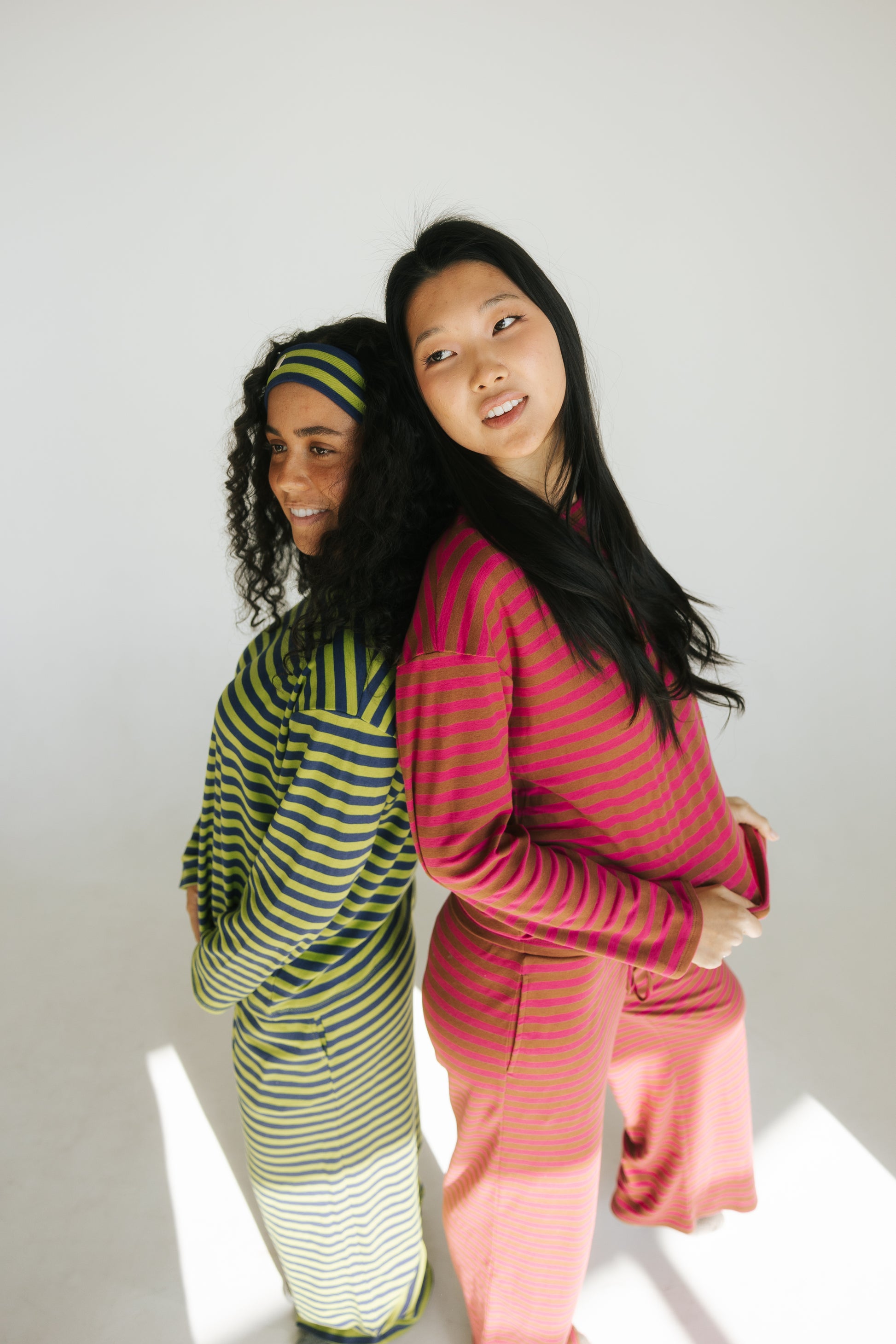 An exclusive ethically made headband! It’s stretchy, it’s comfy, it hides the bad hair days away. Genuinely one of my favorite pieces we have made. Complete your lounge look with the matching striped headband. From the same soft, breathable fabric, it adds a stylish touch while keeping your hair in place. This headband offers both comfort and a pop of style, whether you’re relaxing at home or stepping out.
