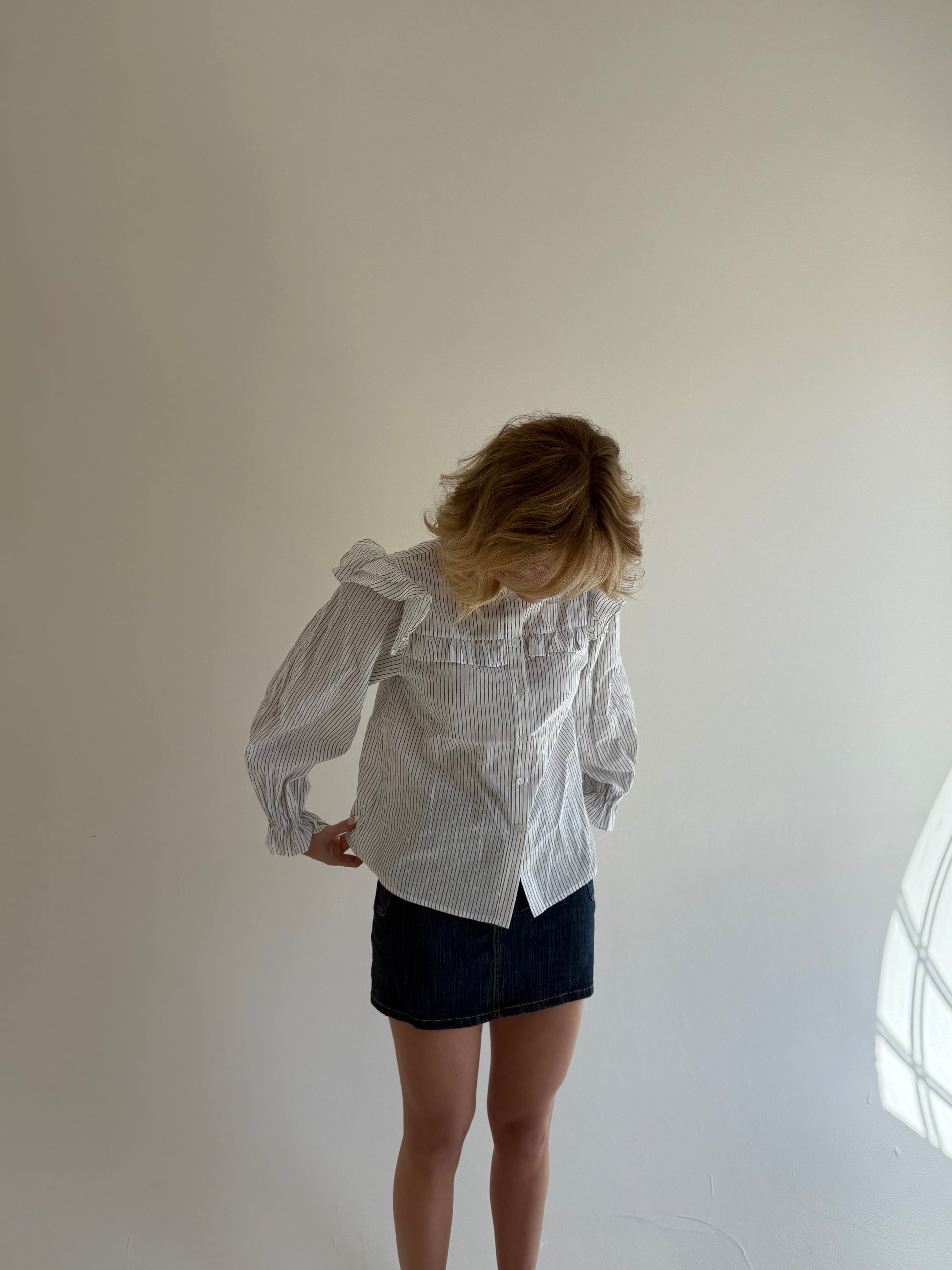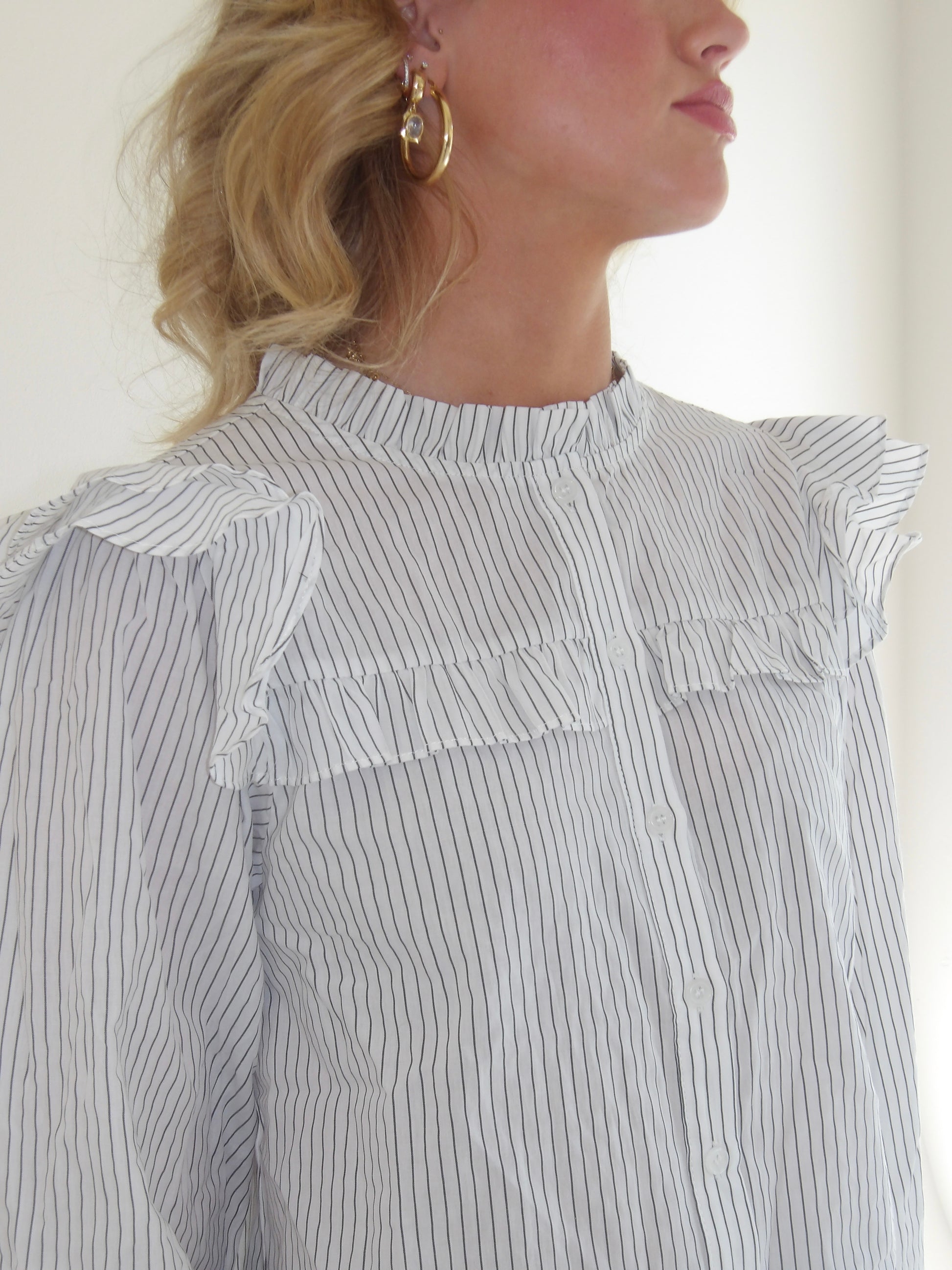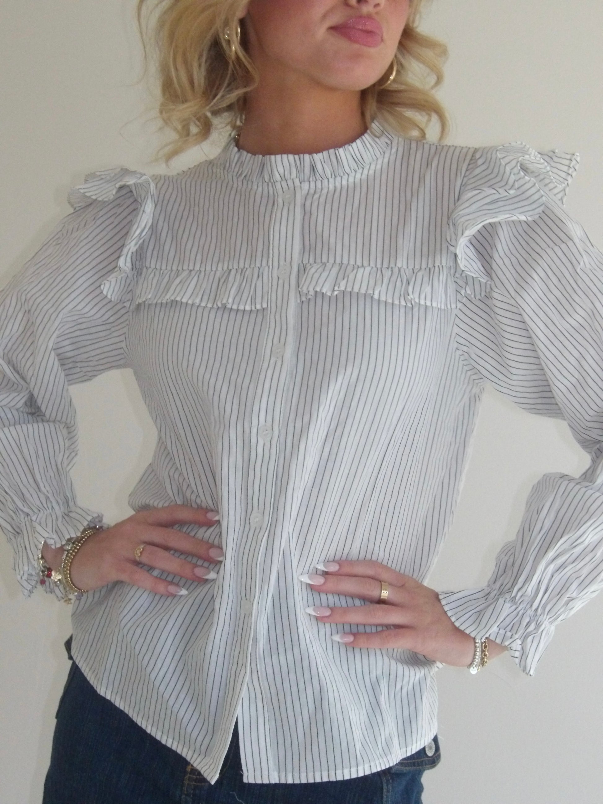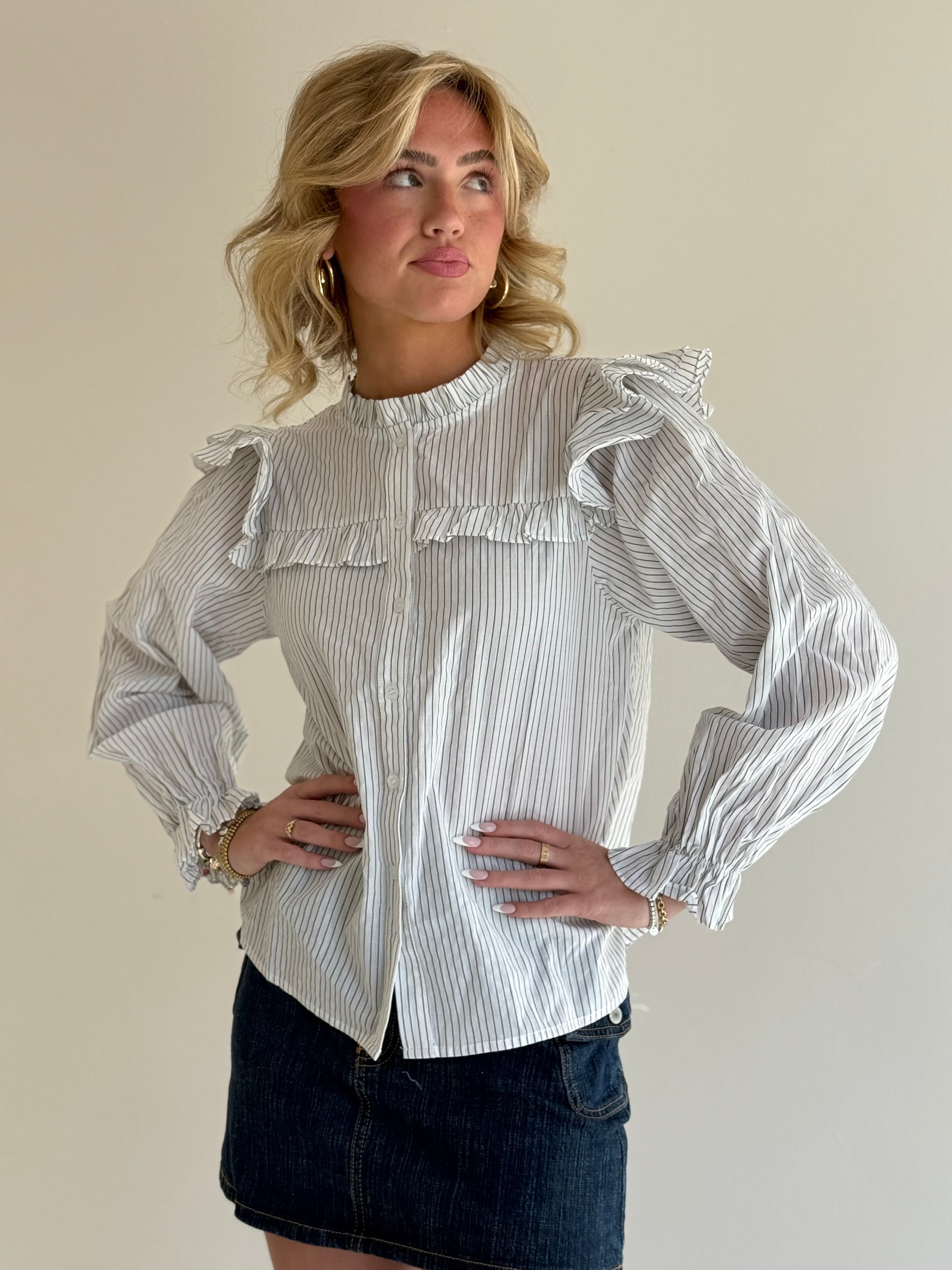 Delicate and dreamy, The Riot Striped Poet Blouse is a lightweight button-up with thoughtful details that make it feel extra special. Featuring micro dark grey stripes on soft white, it’s finished with a frilled neckline, matching yoke, and layered ruffle shoulders. Long poet sleeves complete the look—perfect for pairing with denim or dressing up for a timeless, effortless feel.