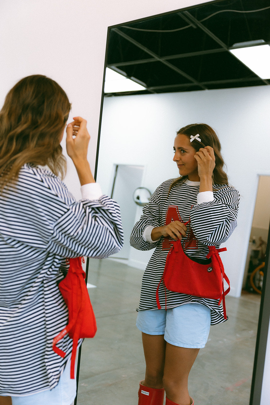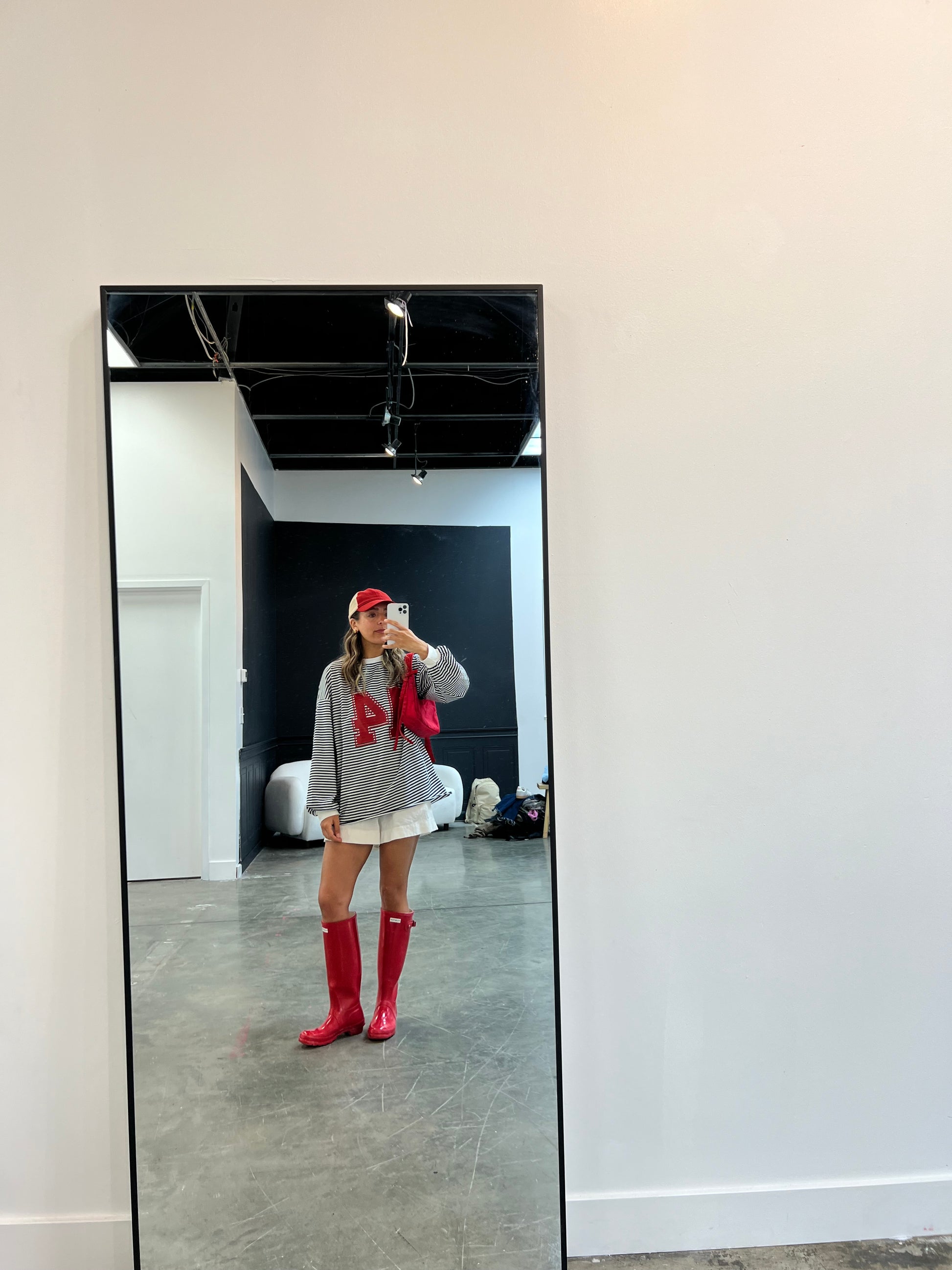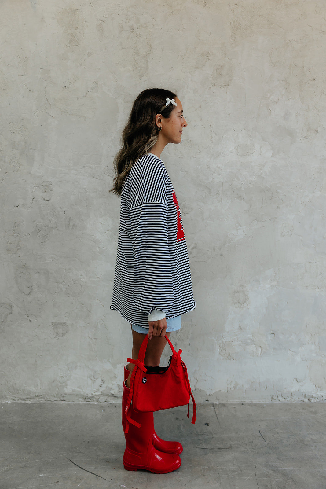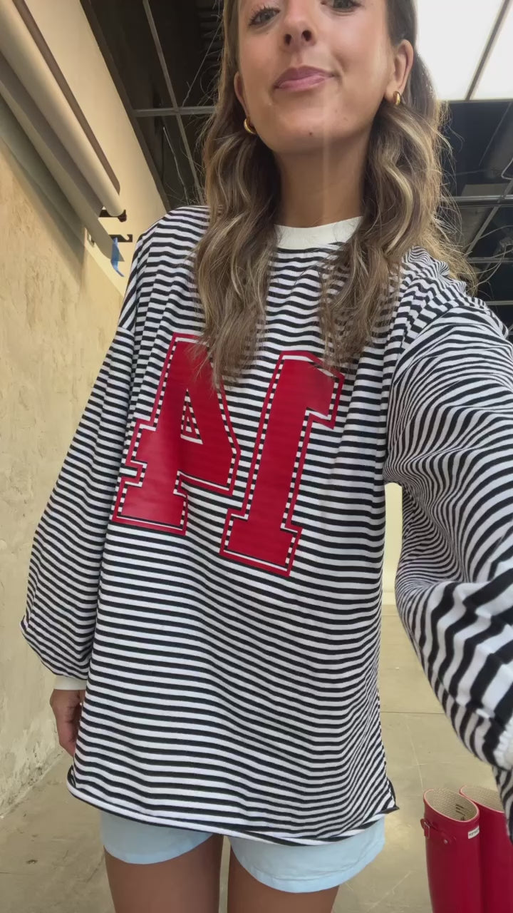 A cozy, oversized b&w versatile striped long tee with a RIOT varsity number design to add a unique cool touch.