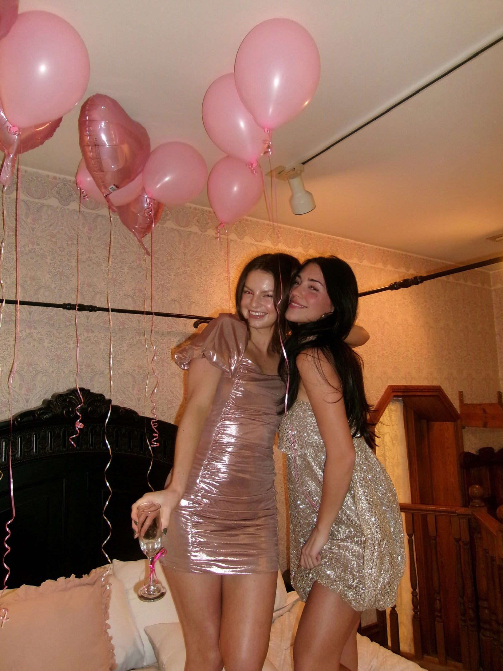 unique, beautiful dress with puff detailing and square neckline. scrunches for extreme flatter. gorgeous reflective rosy pink color for a girly, romantic night. perfect for dances or dates, of course.