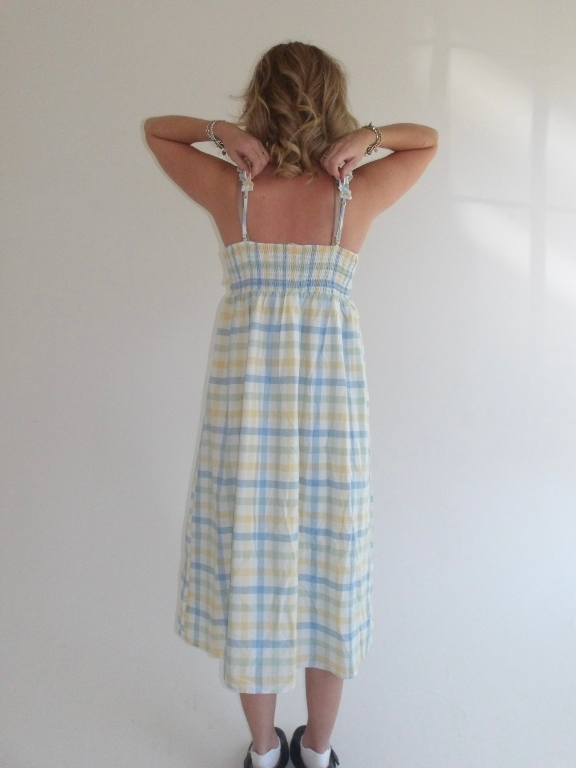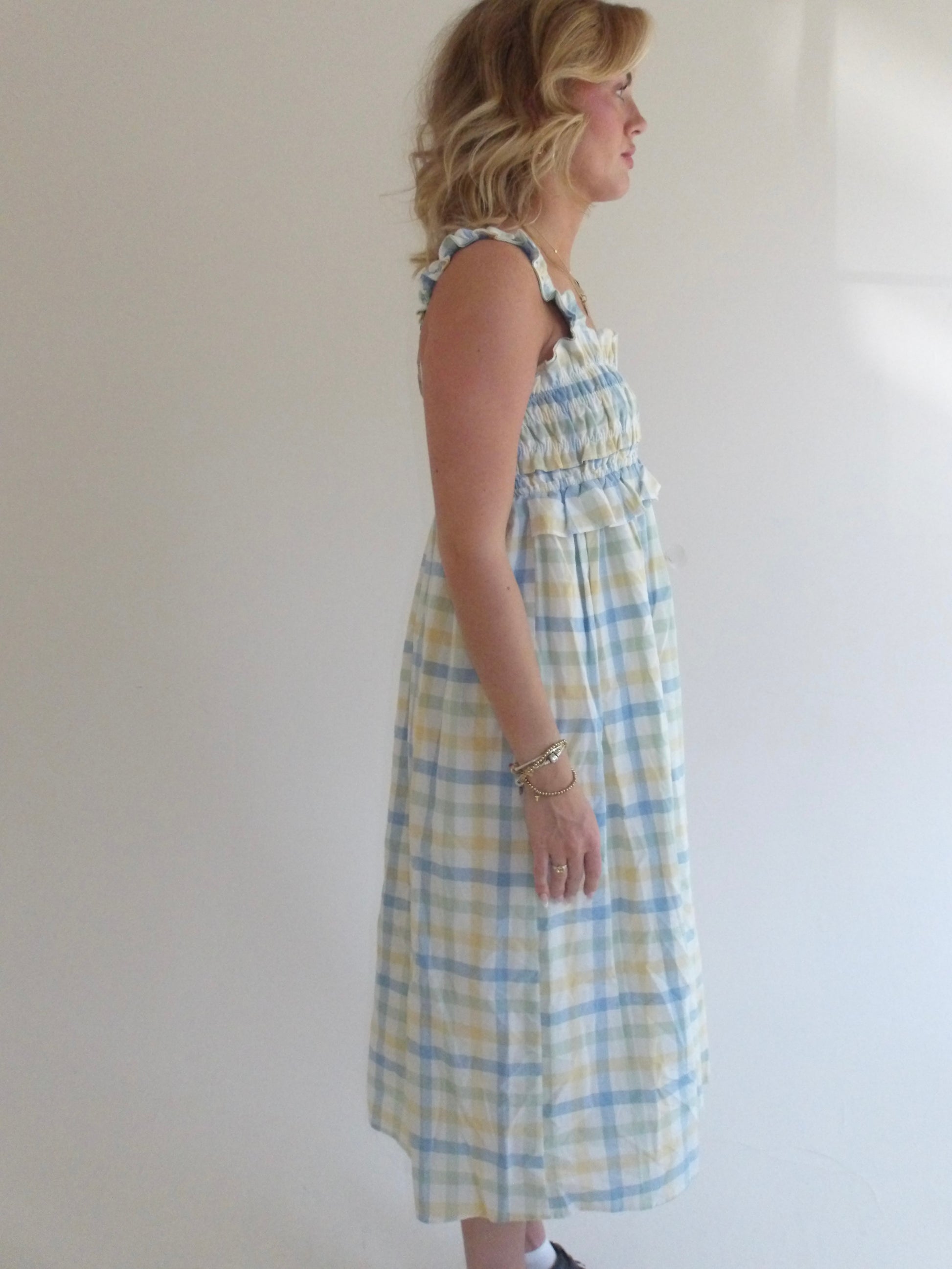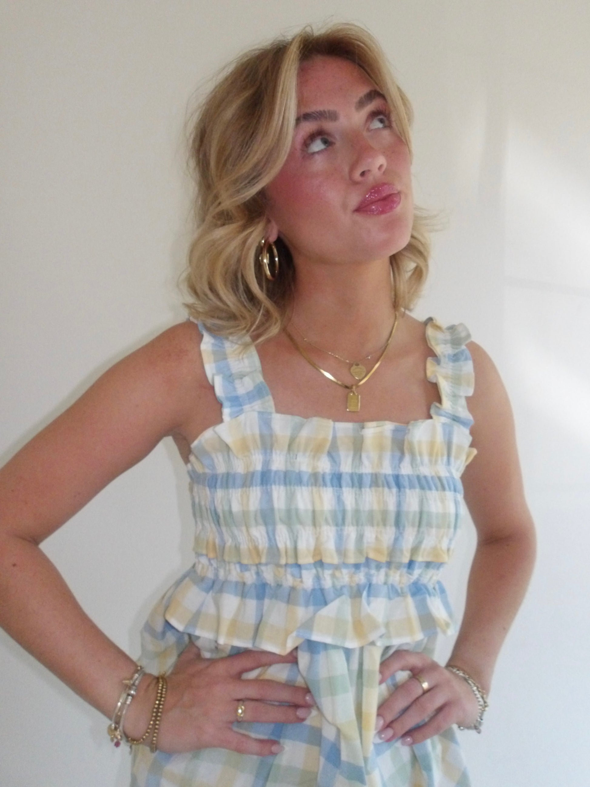 Soft, Airy & made for sunny days, the Sunday Gingham Picnic Dress is a flowy maxi dress that features a soft pastel plaid pattern and breathable fabric that moves with you. Ruffled tank straps and layered tiers bring playful texture, while the cinched chest detail offers a flattering, feminine shape. An easy favorite for springtime strolls, garden parties, and everything in between.