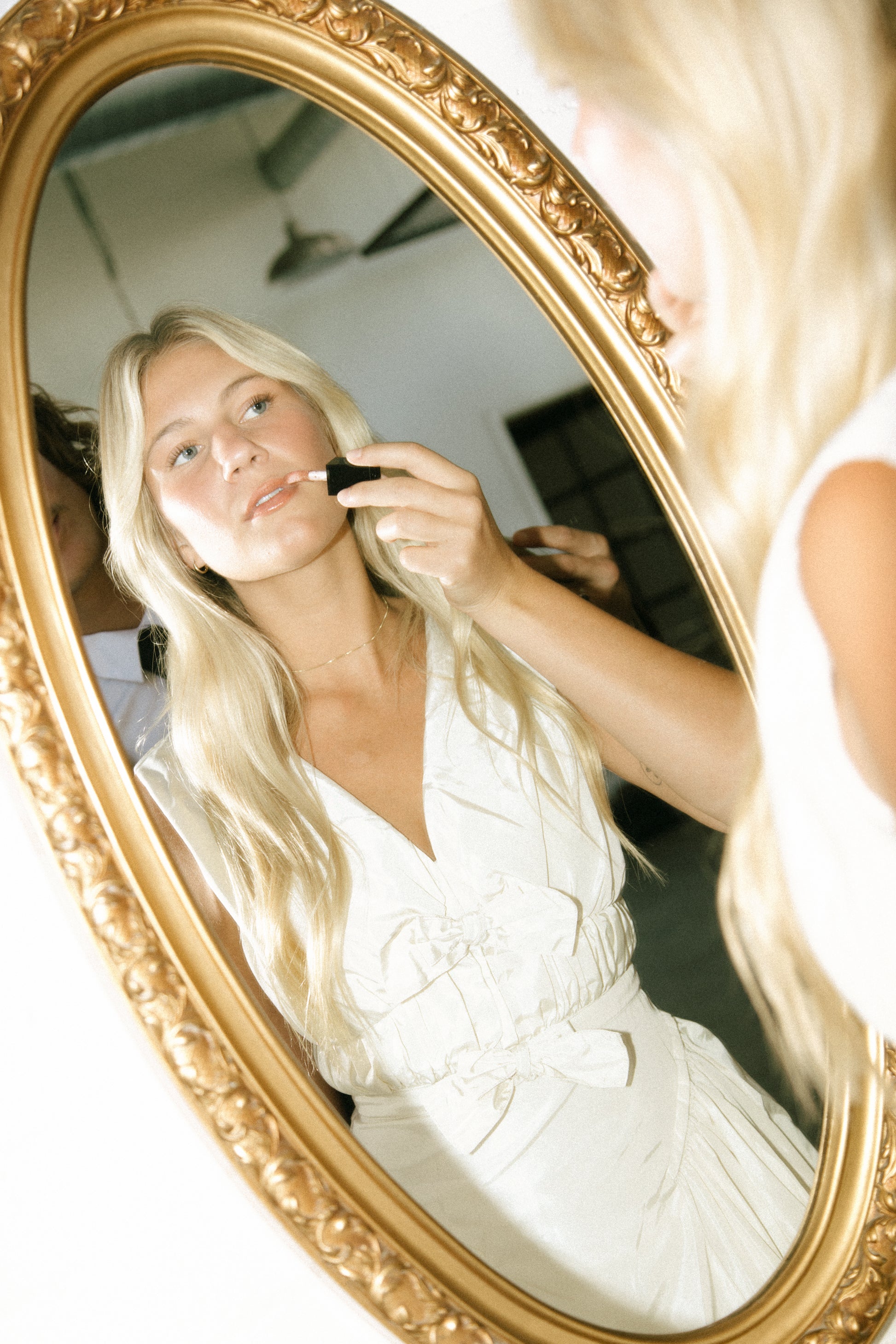 A beautiful creamy timeless dress with classic bows along the waistline for a unique touch. A modern neckline and thick tank sleeves. The waistline is v shaped to best flatter your waist. A timeless midi length