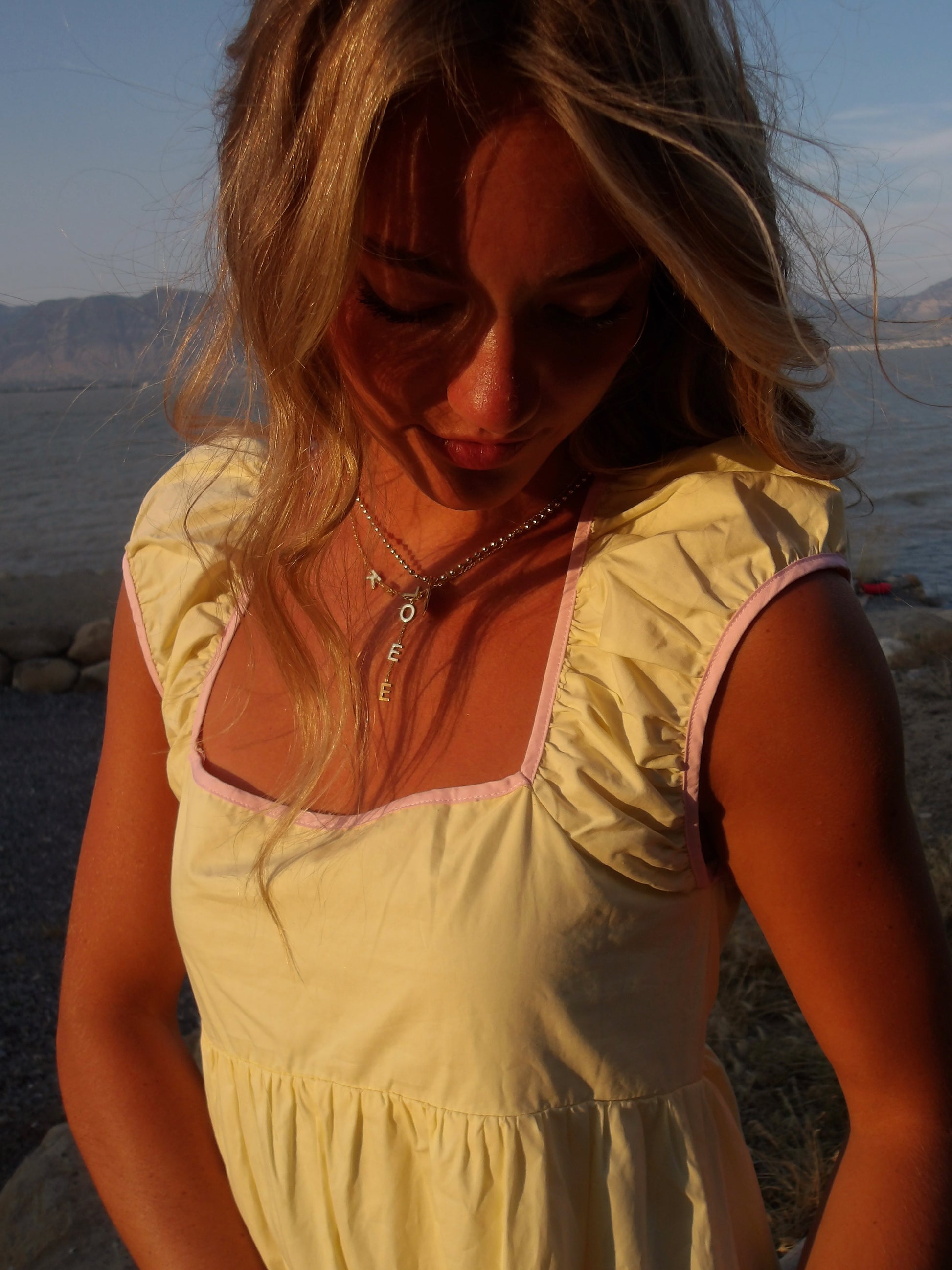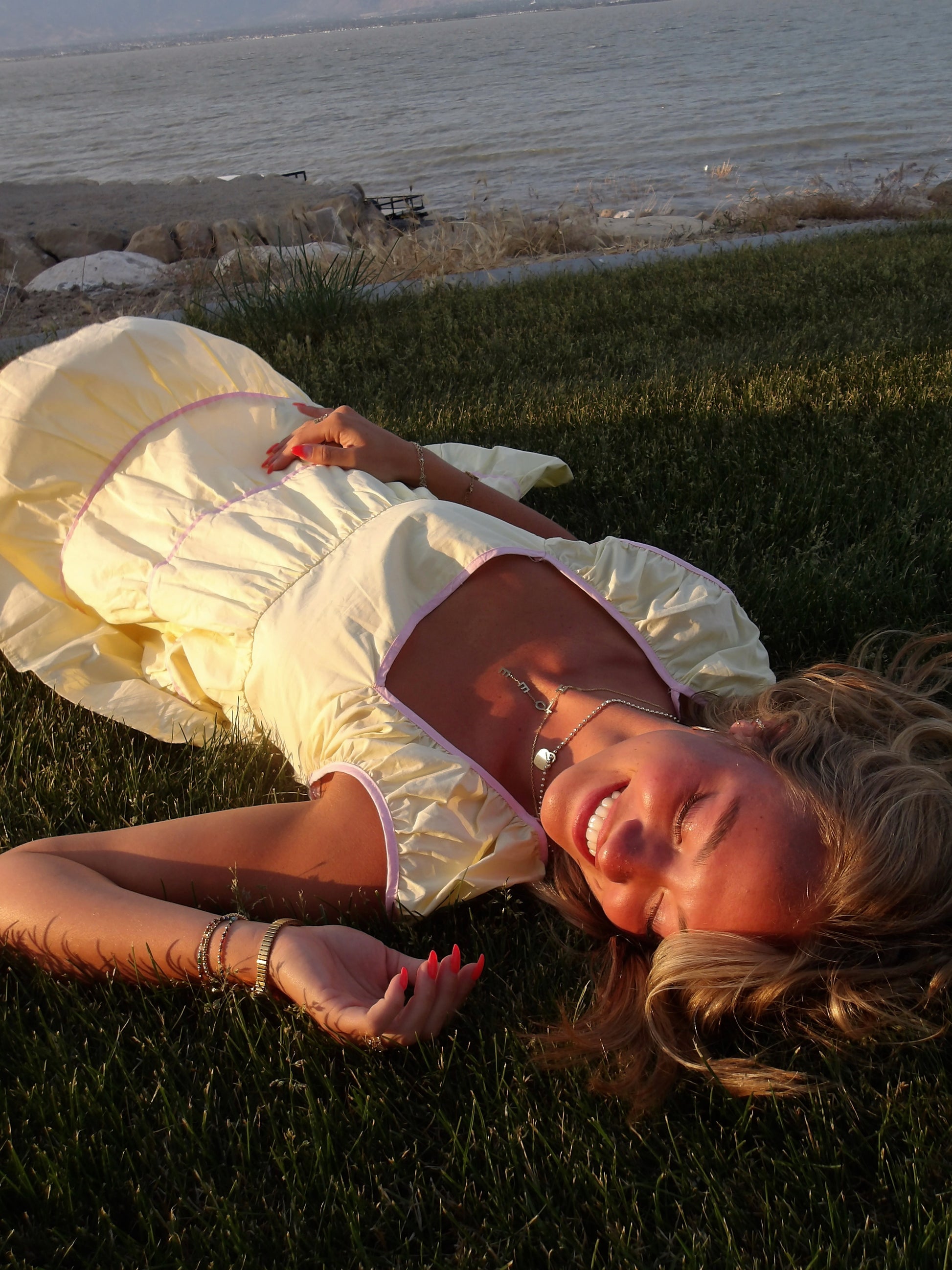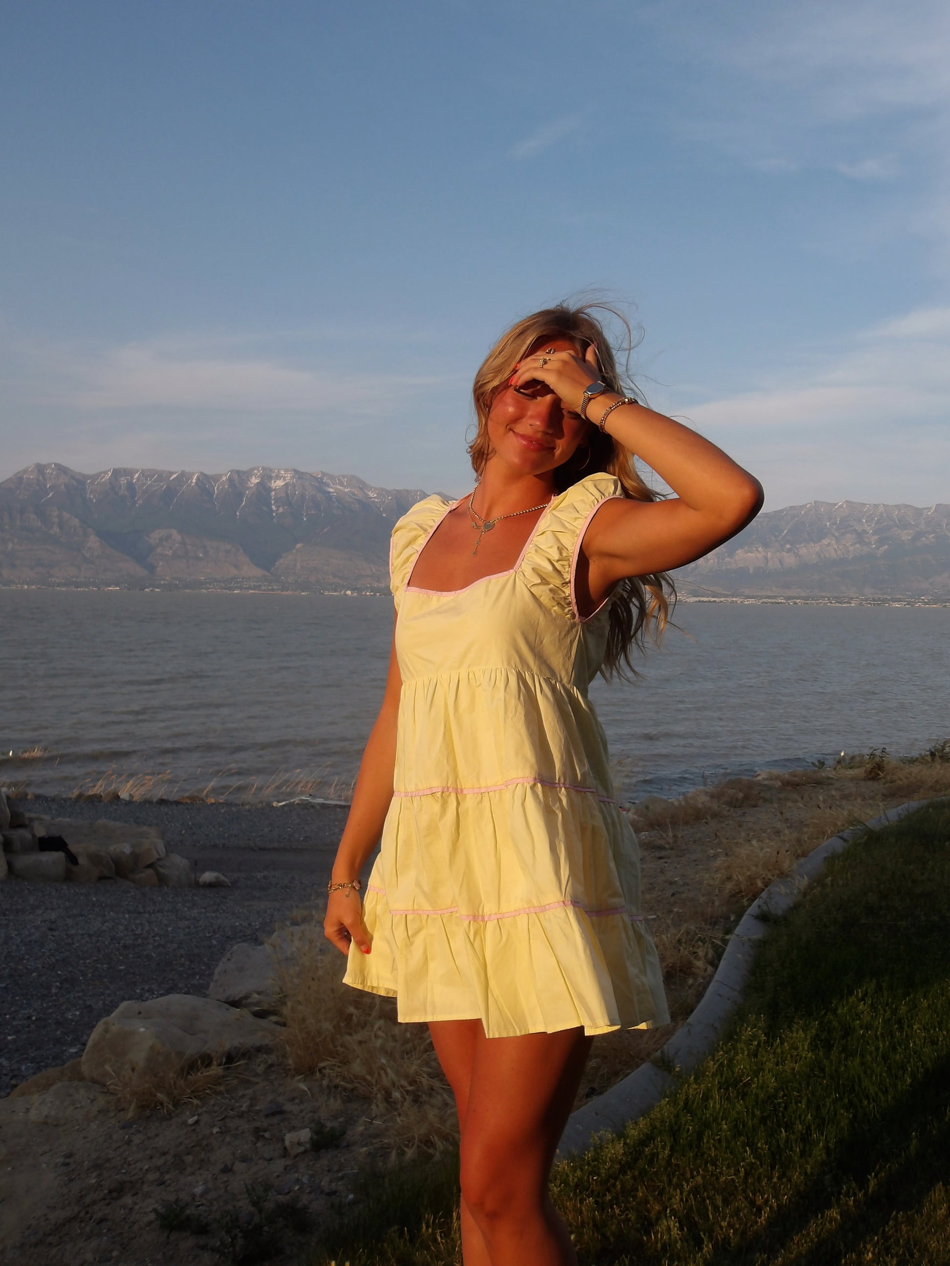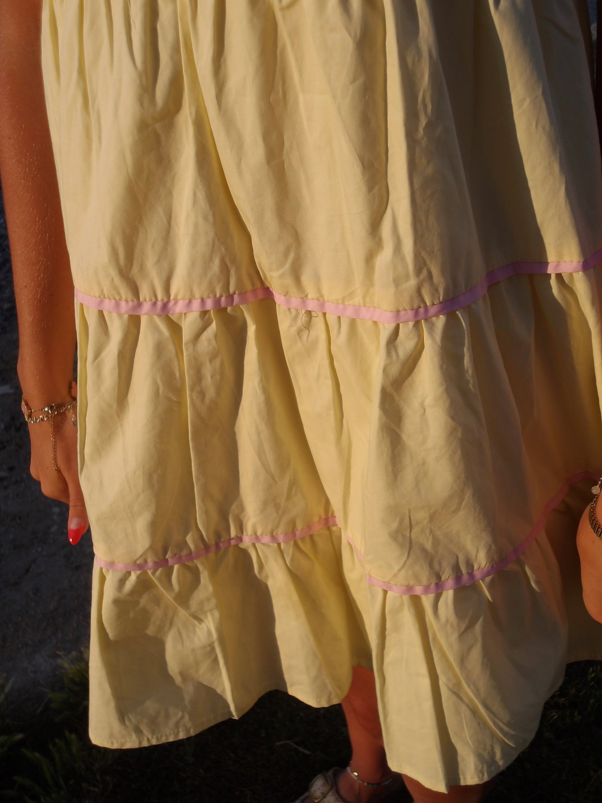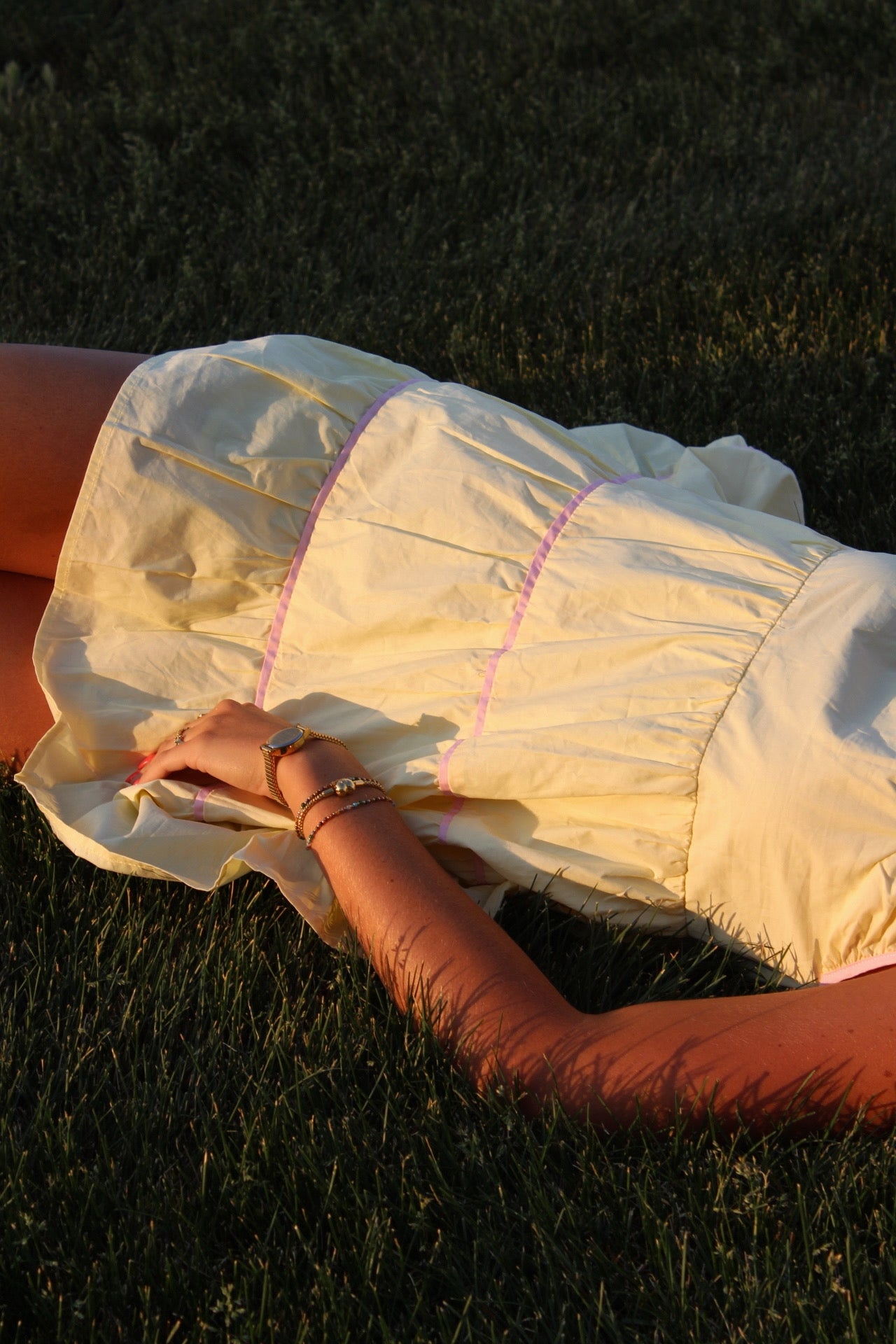 A dress that looks like summer tastes. The Starburst Lemonade Mini is crafted from 100% cotton in a dreamy butter yellow with soft pink contrast lining, think pink starburst meets golden hour glow. Designed with a breezy A-line silhouette, this mini features a full shoulder tank sleeve, a fully lined bodice, and a back bow tie for easy wear. The shoulder coverage and mini hem keep it flirty yet functional, ideal for anything from farmers market mornings to summer parties.
