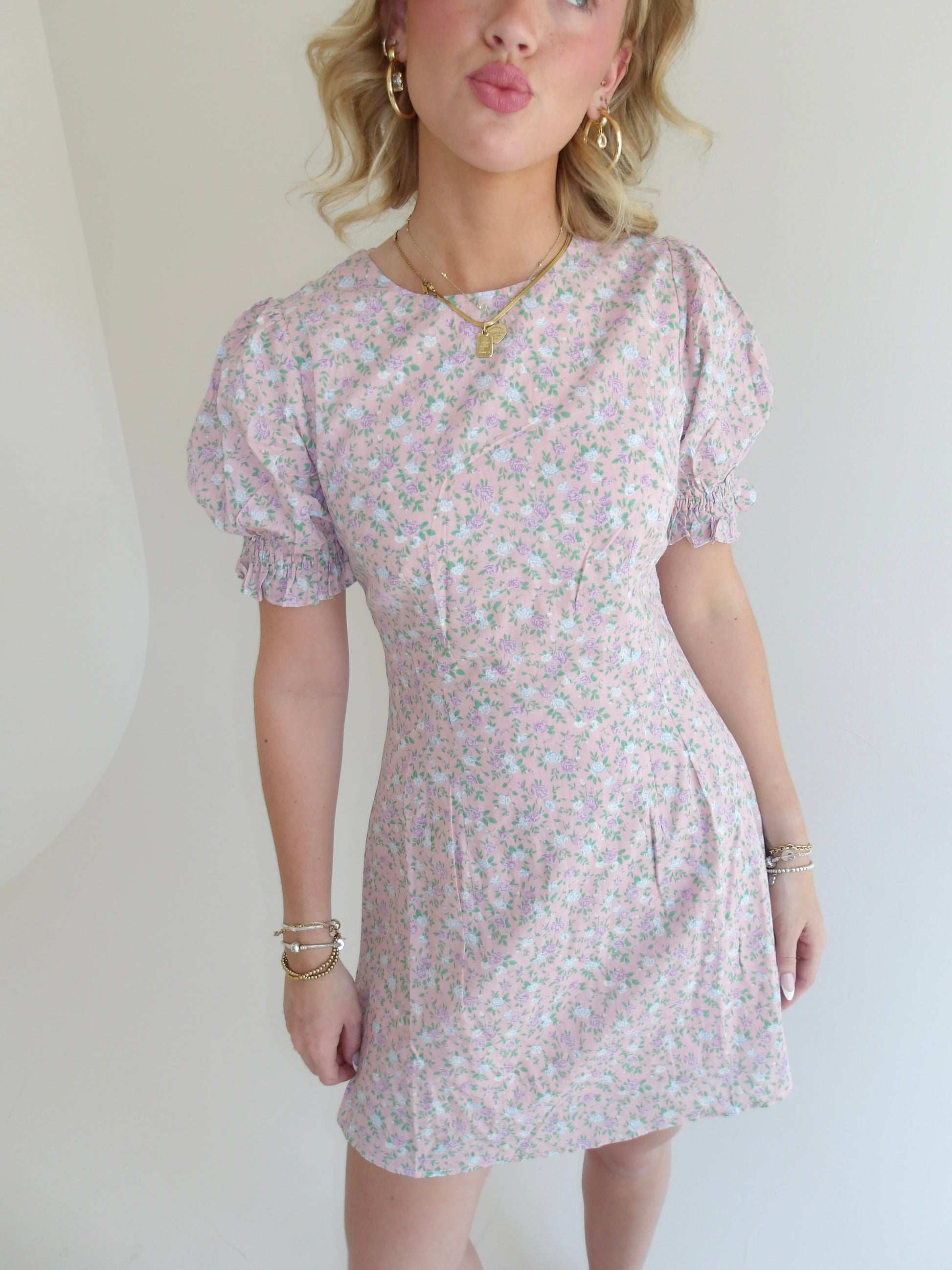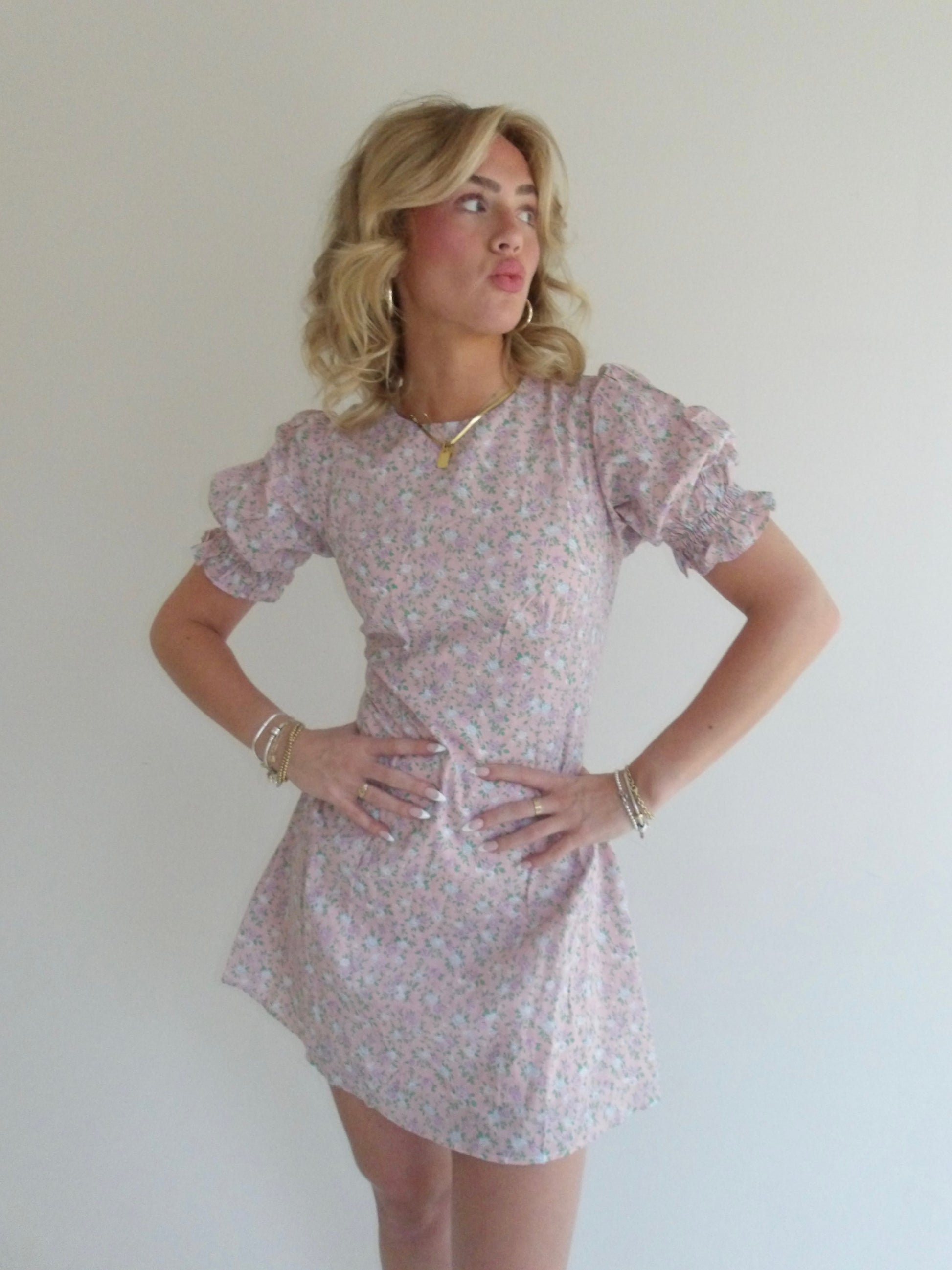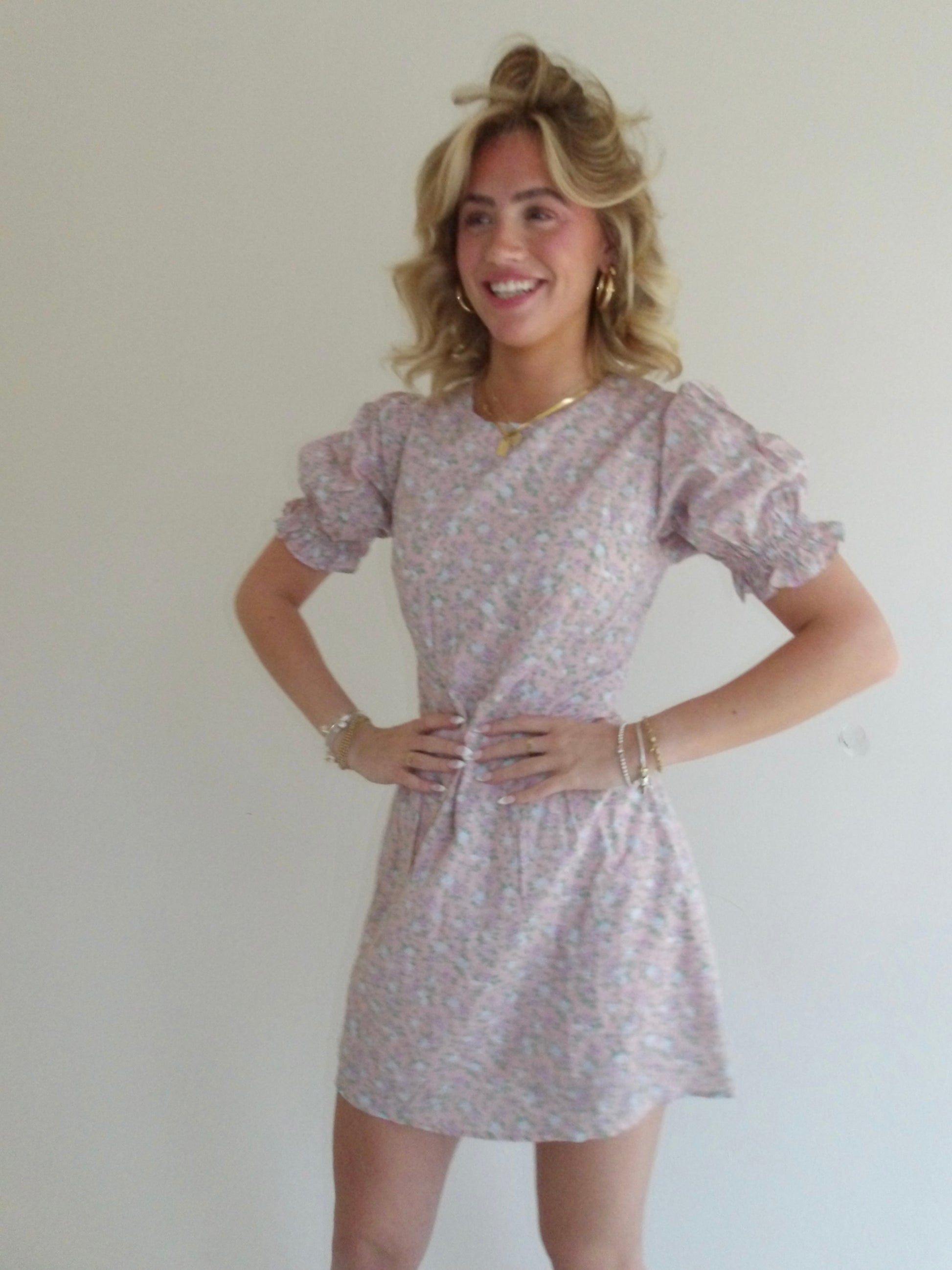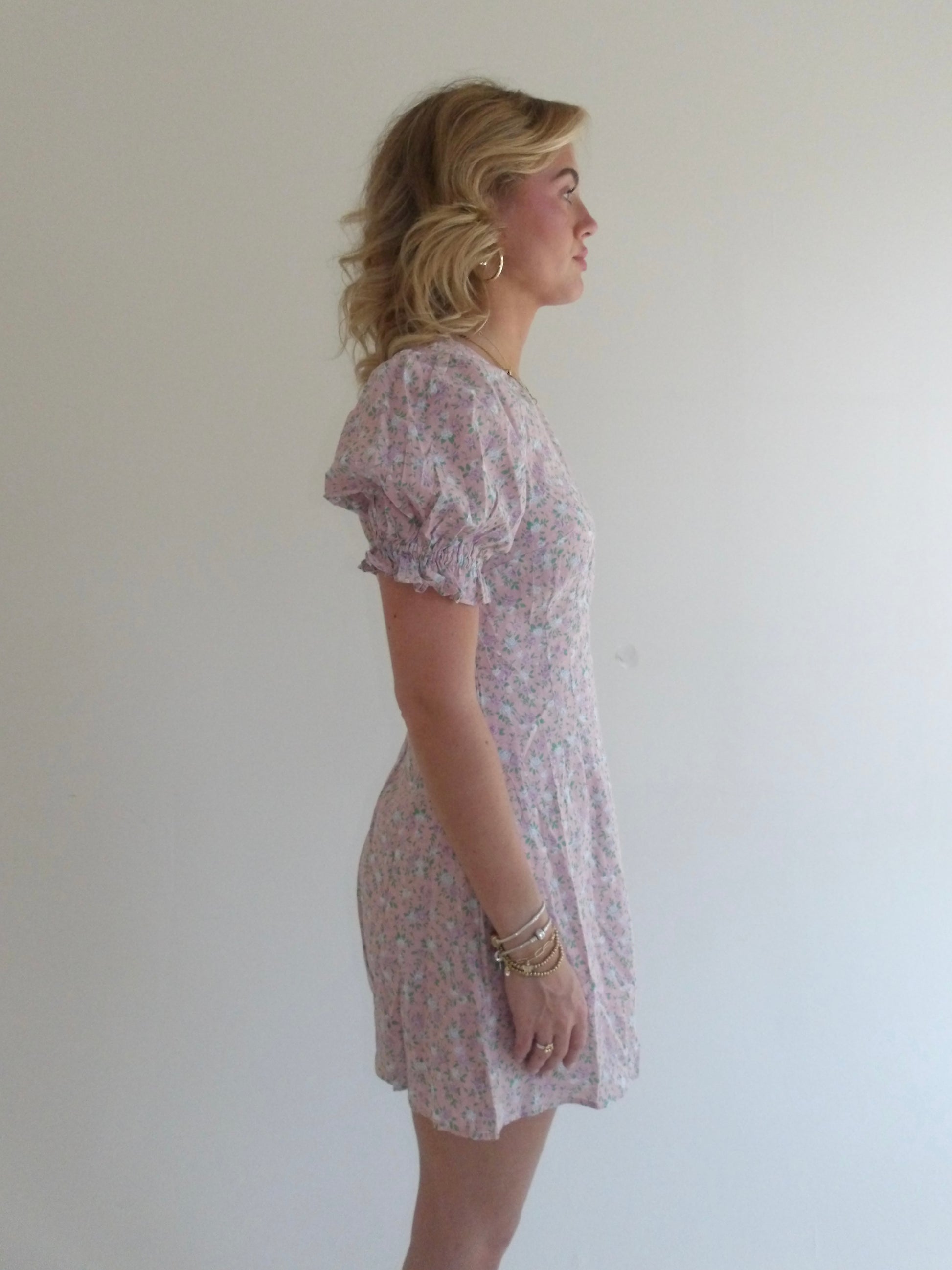The Sunday May Mini Dress is a flirty little number bringing all the vintage feelings with its tiny floral print and soft, moody pink tone. A new body-hugging favorite & even with a cinched ruffle sleeves that flatters & hits just right. Easy to throw on, hard not to love.