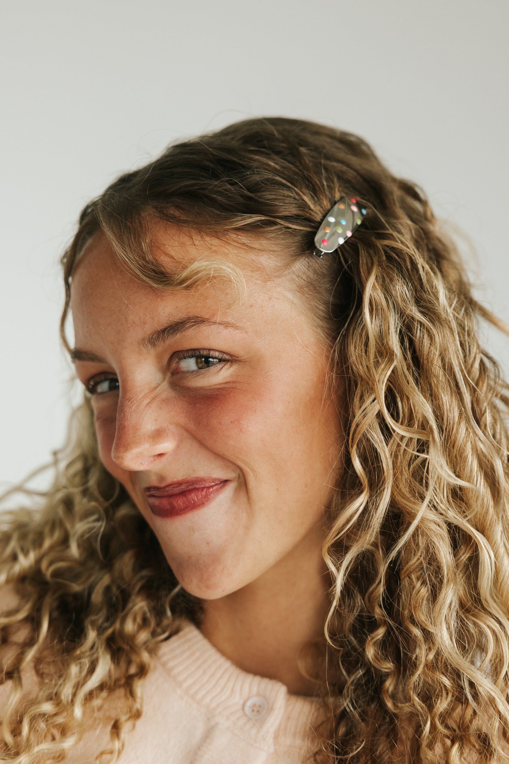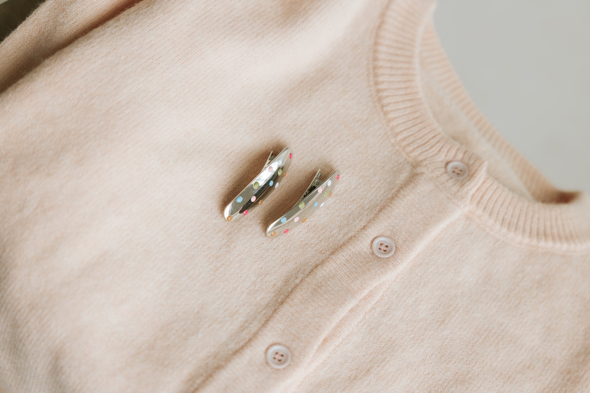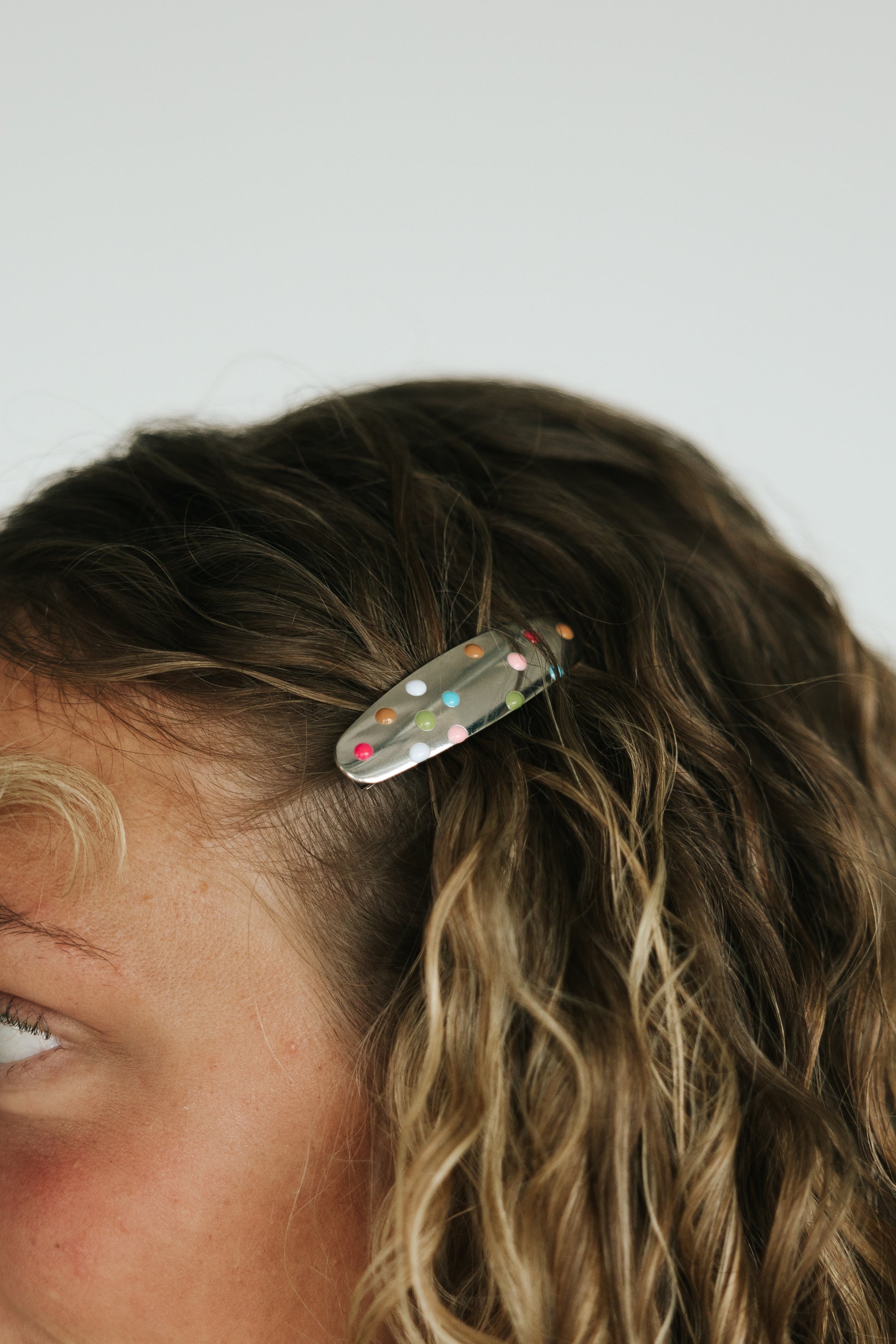 Effortlessly chic and practical, our silver polka dot claw clips are designed to hold your hair securely while adding a stylish touch. Featuring small, playful polka dots against a sleek silver base, these clips offer a versatile, polished look. The set includes two clips, perfect for creating different styles or using both for a fuller hold. Ideal for securing large amounts of hair, they combine both durability and elegance, making them a must-have accessory for any hair routine!