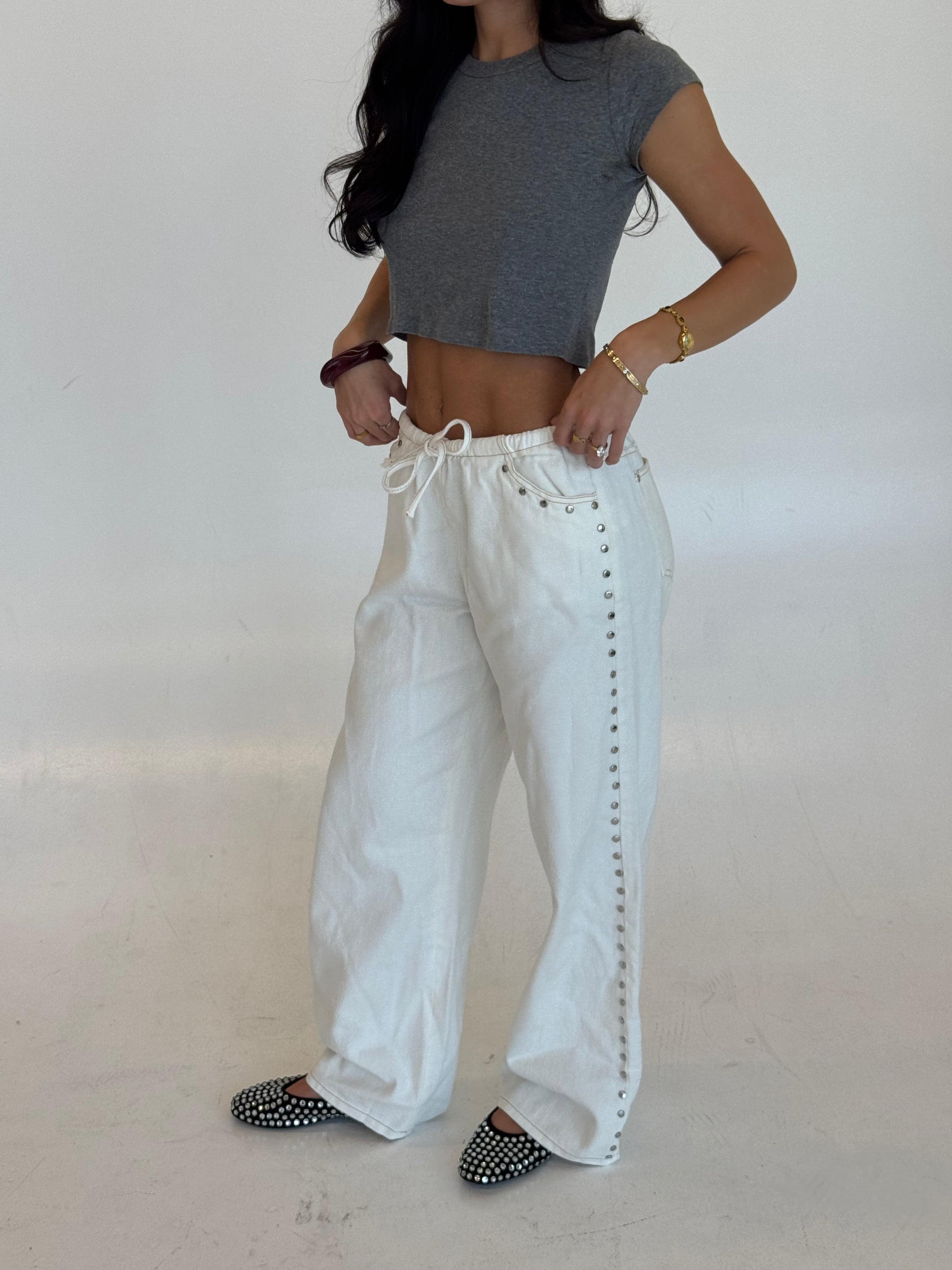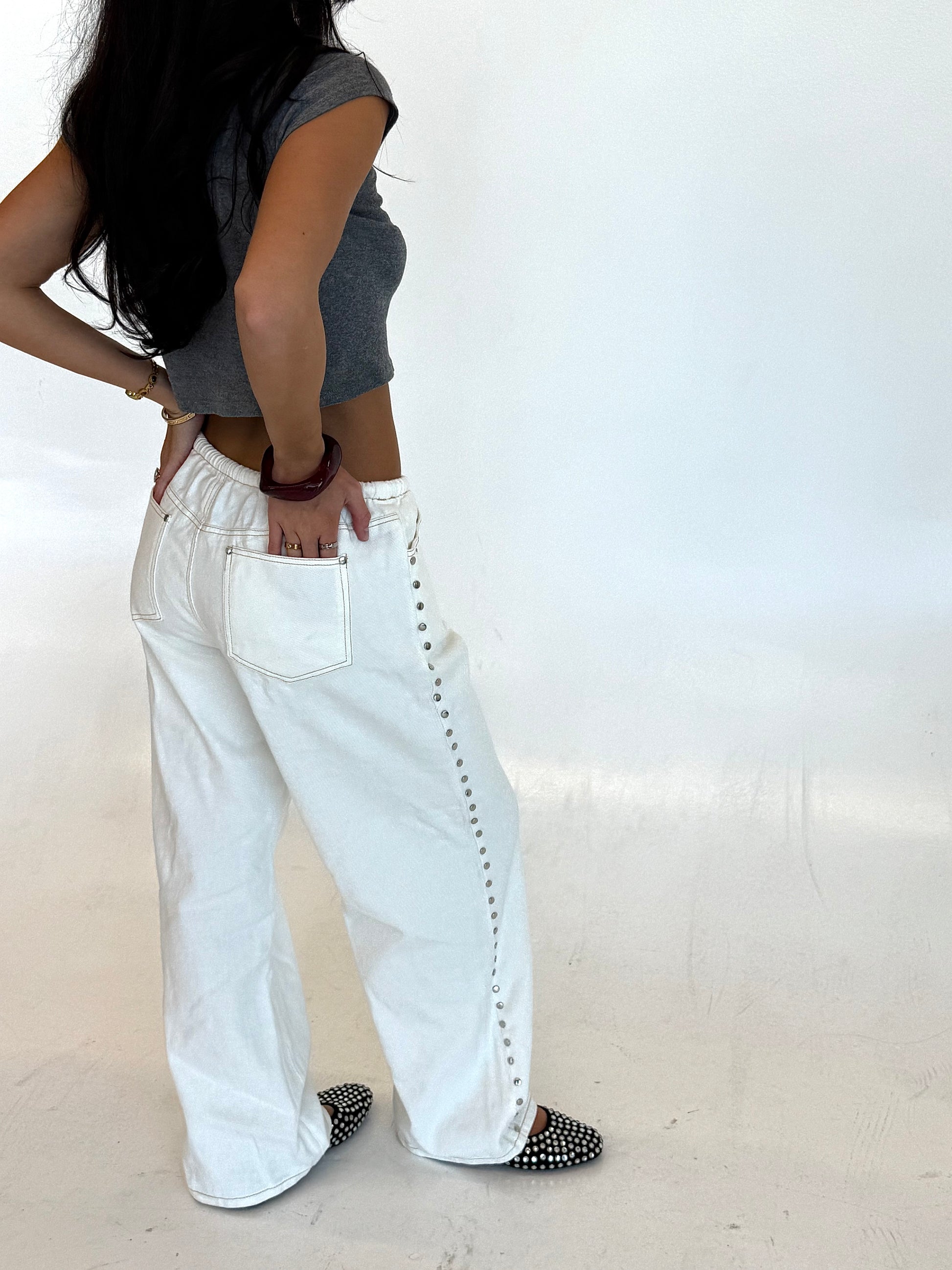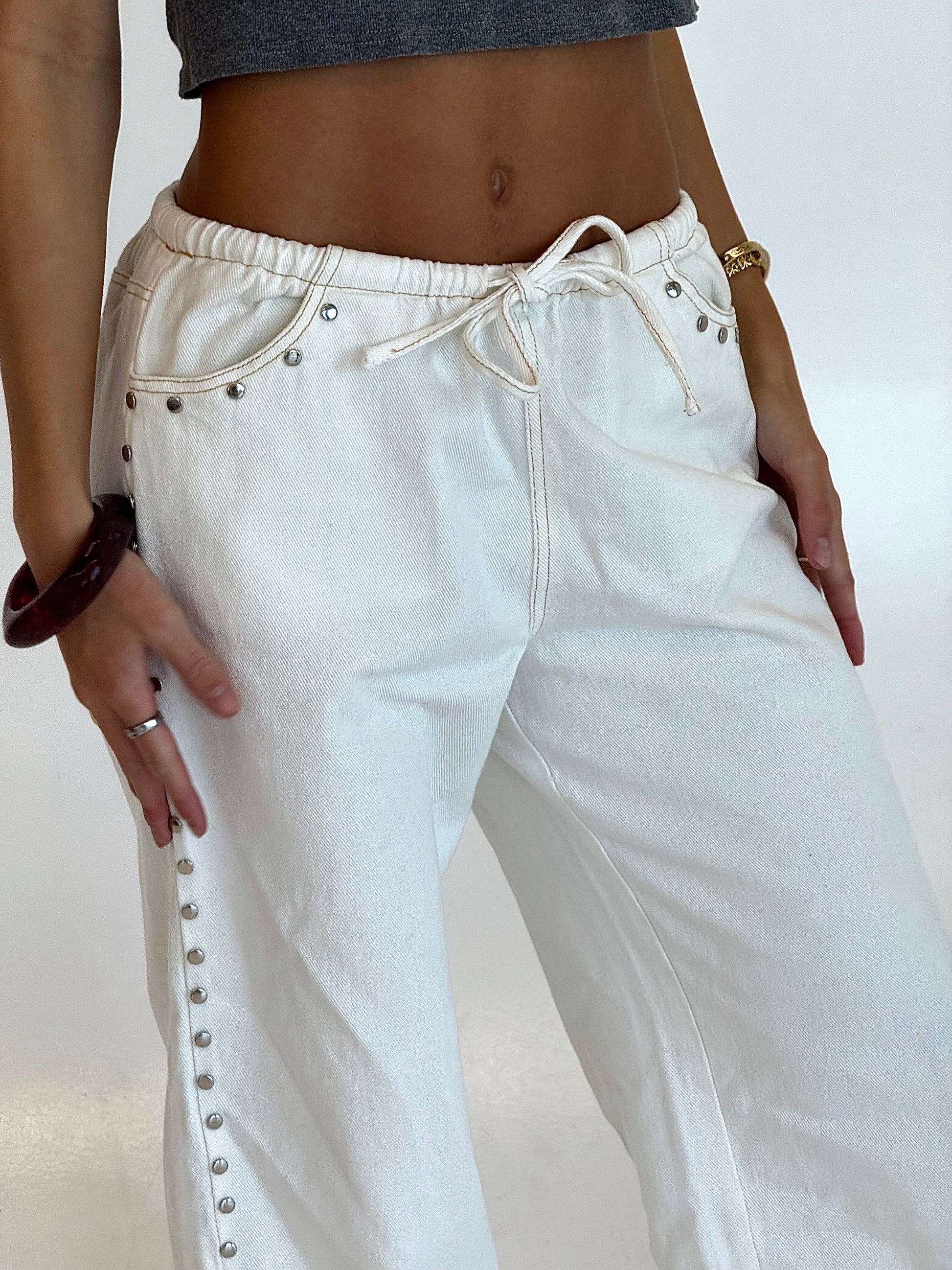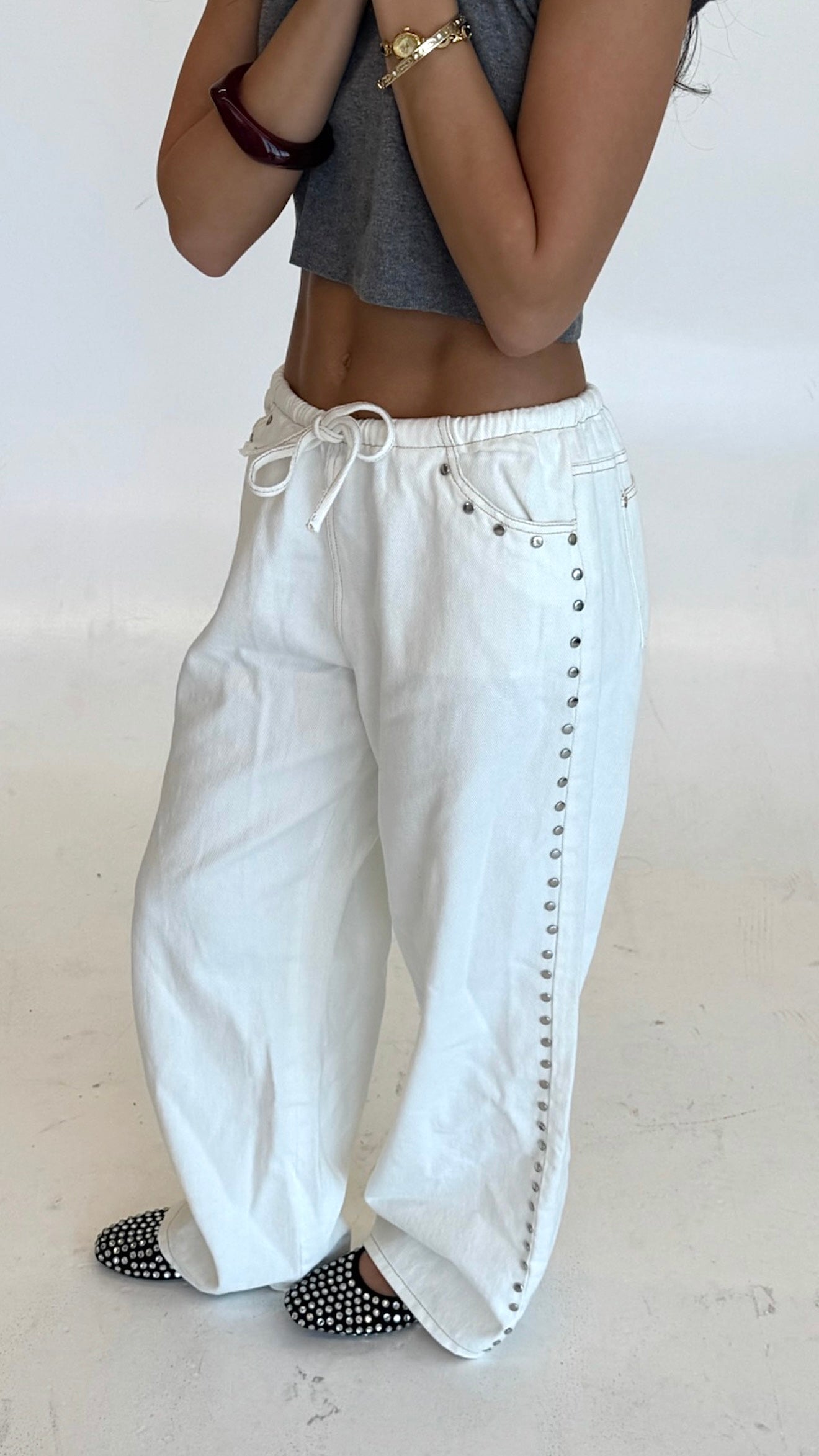 We don't do jeans unless they feel like sweats. Comfi, baggy, adjustable drawstring, unique studs along the pants. Our gift to everyday wear!