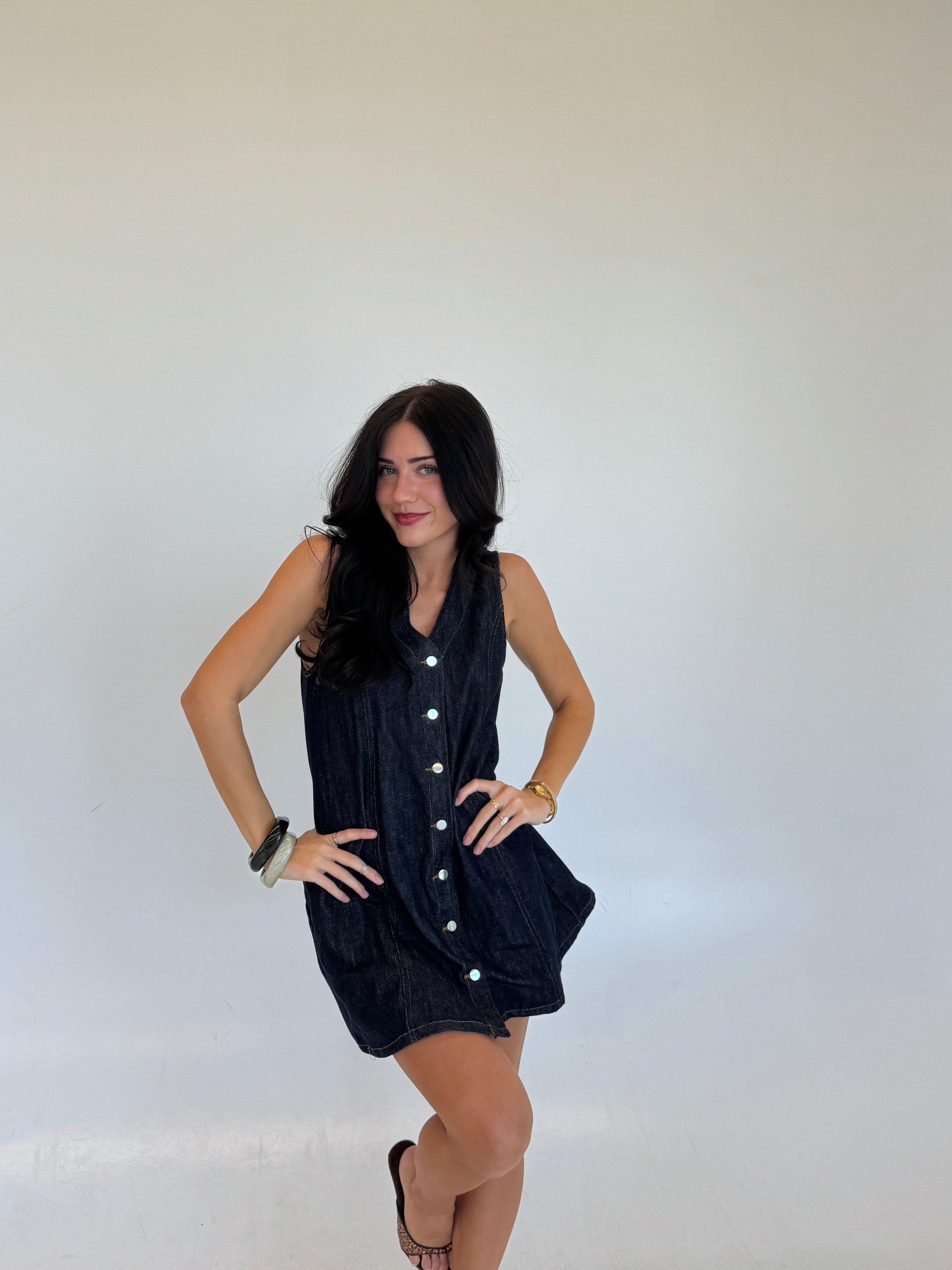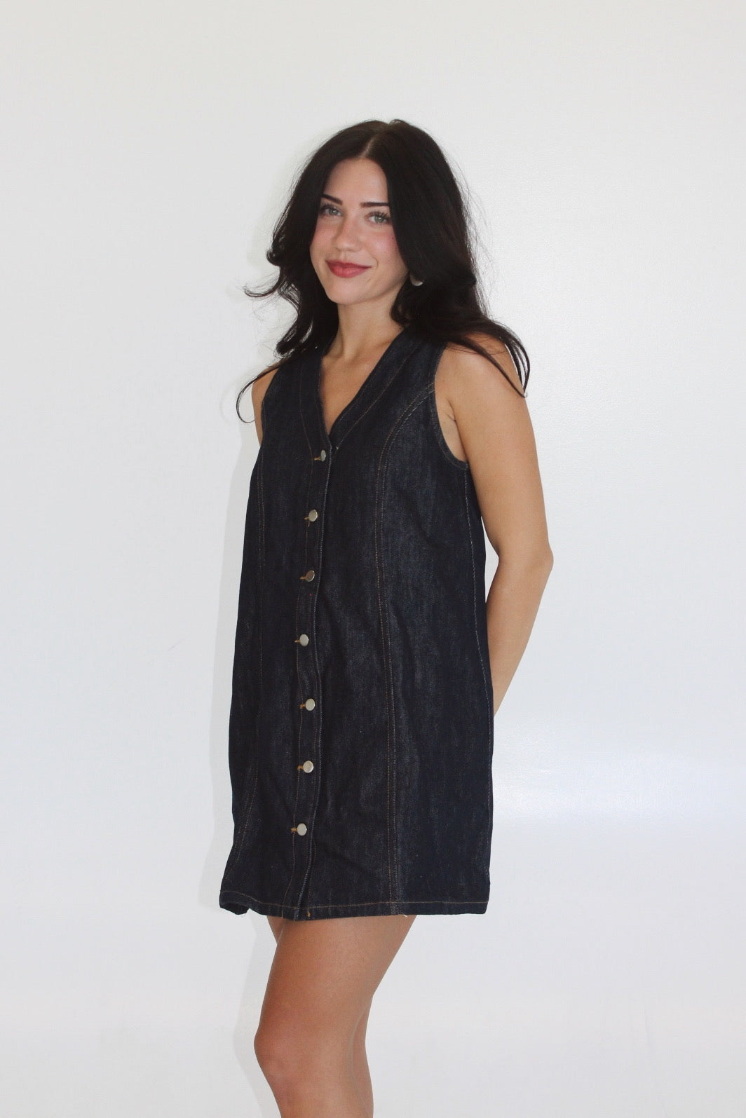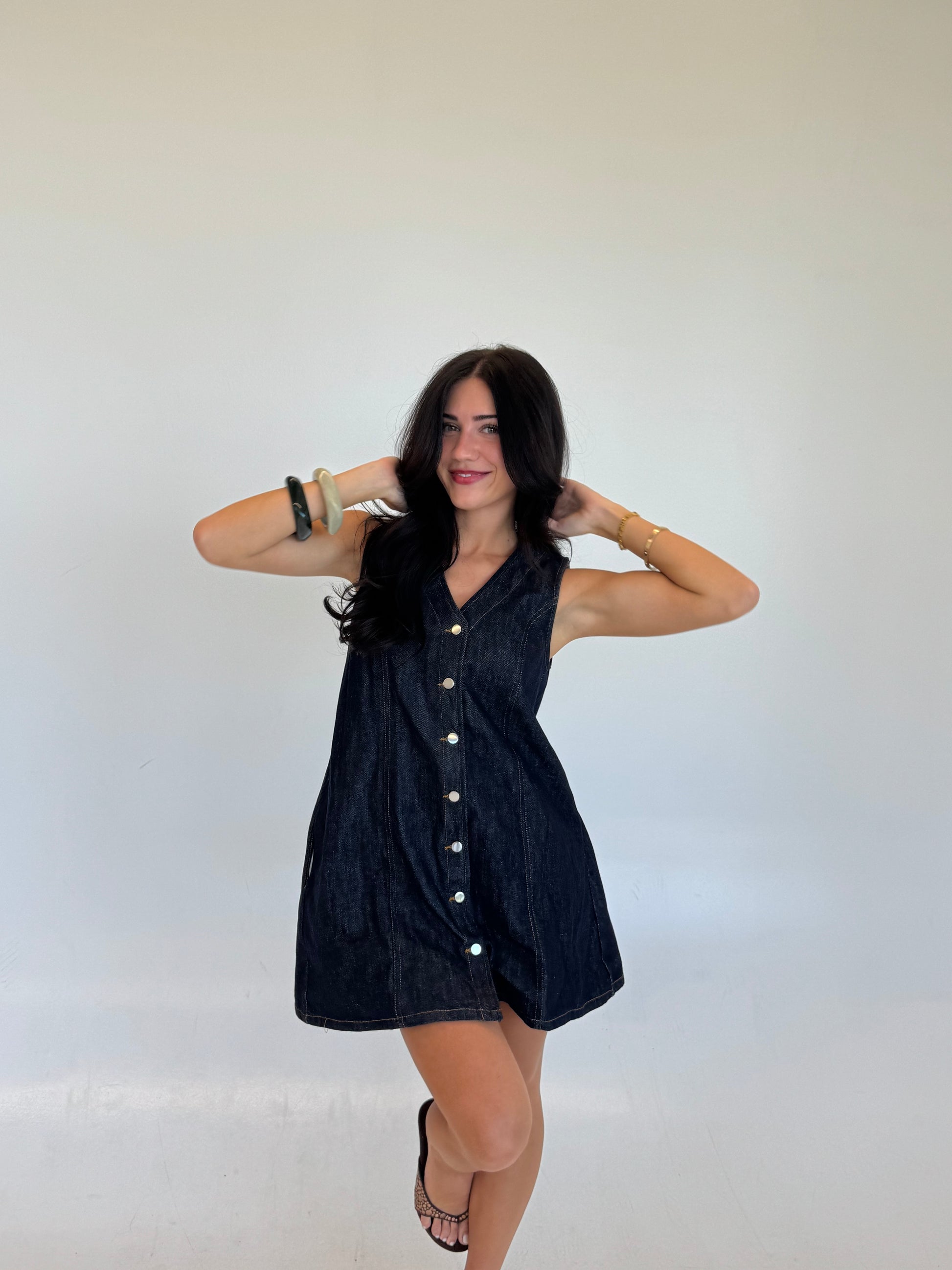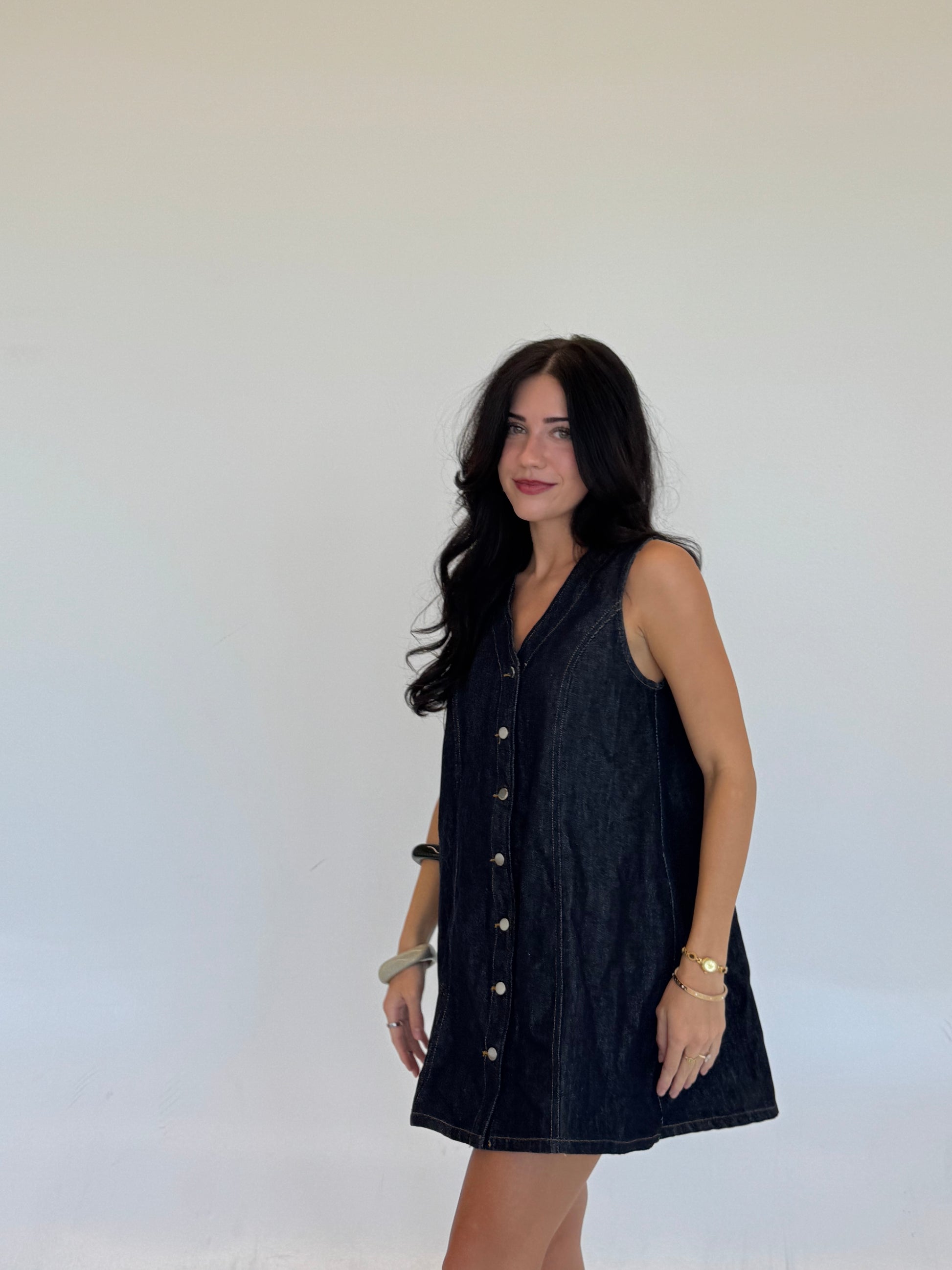 A dark washed denim dress with buttons along. The easiest Summer to Fall transition you've ever seen with hint of a forever denim classic!