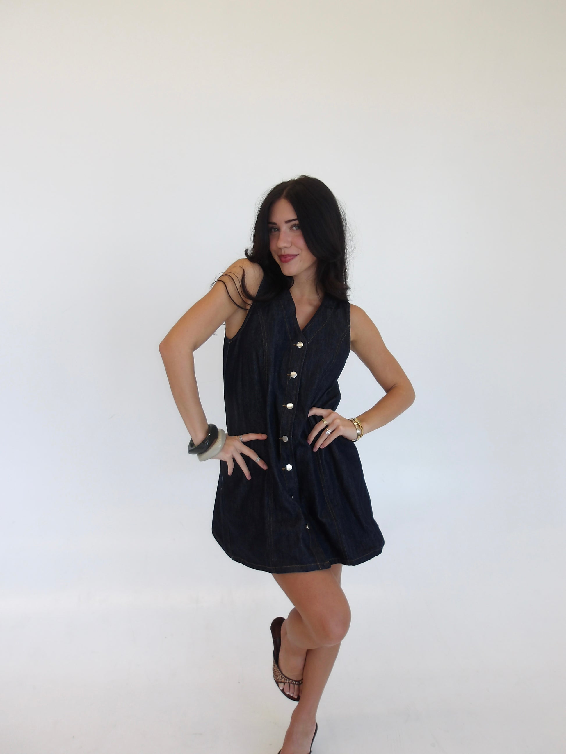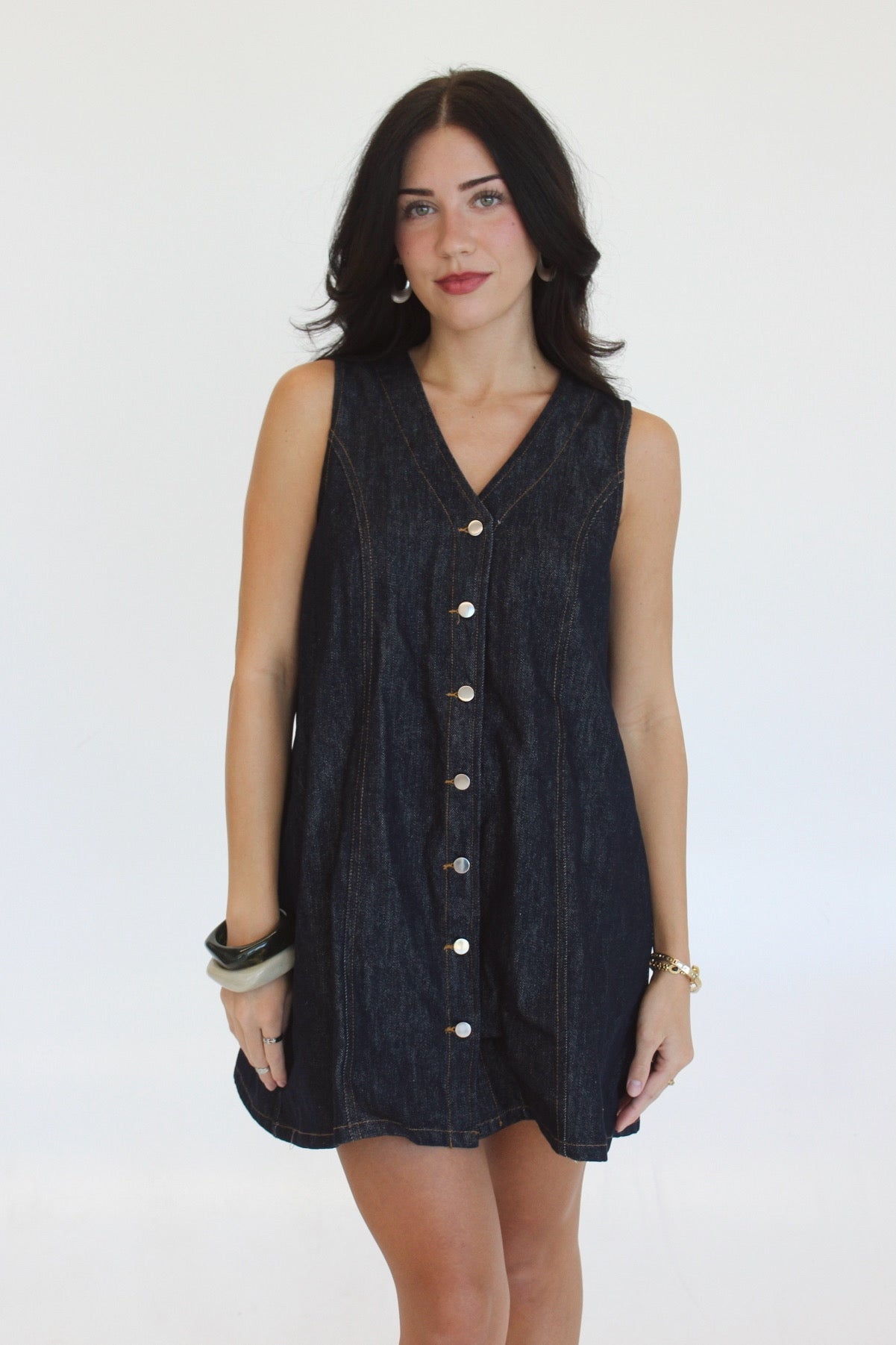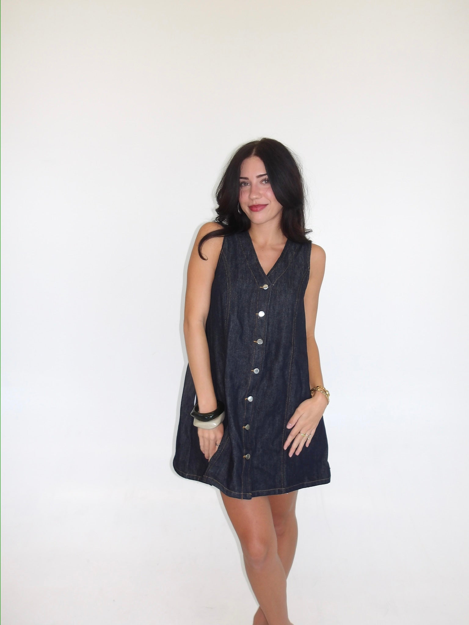 A dark washed denim dress with buttons along. The easiest Summer to Fall transition you've ever seen with hint of a forever denim classic!