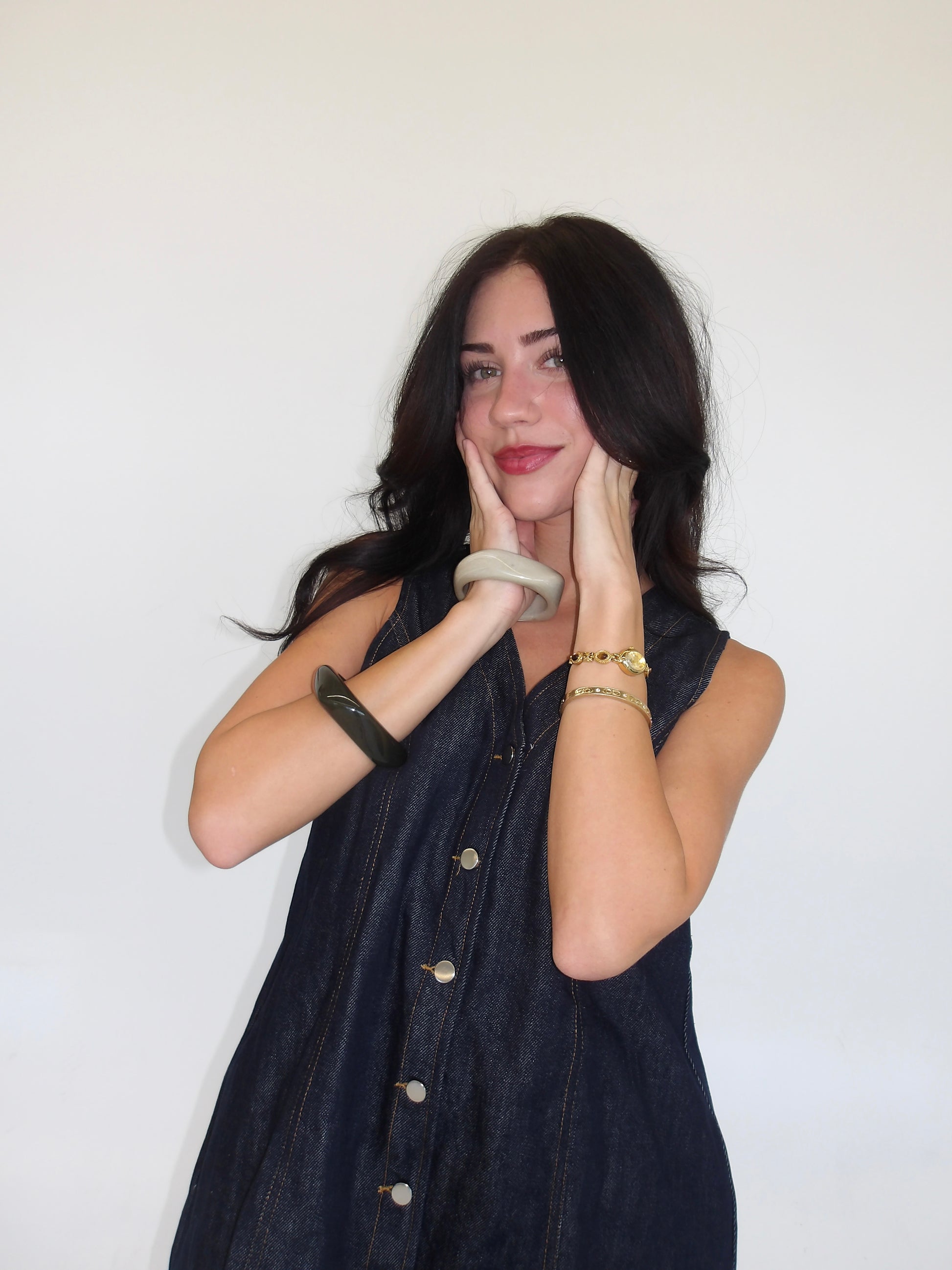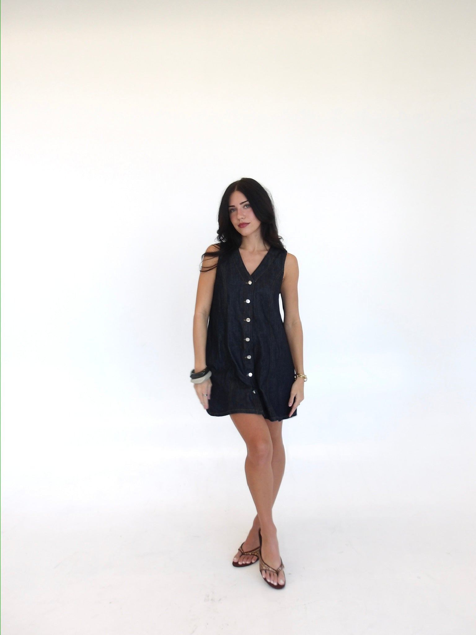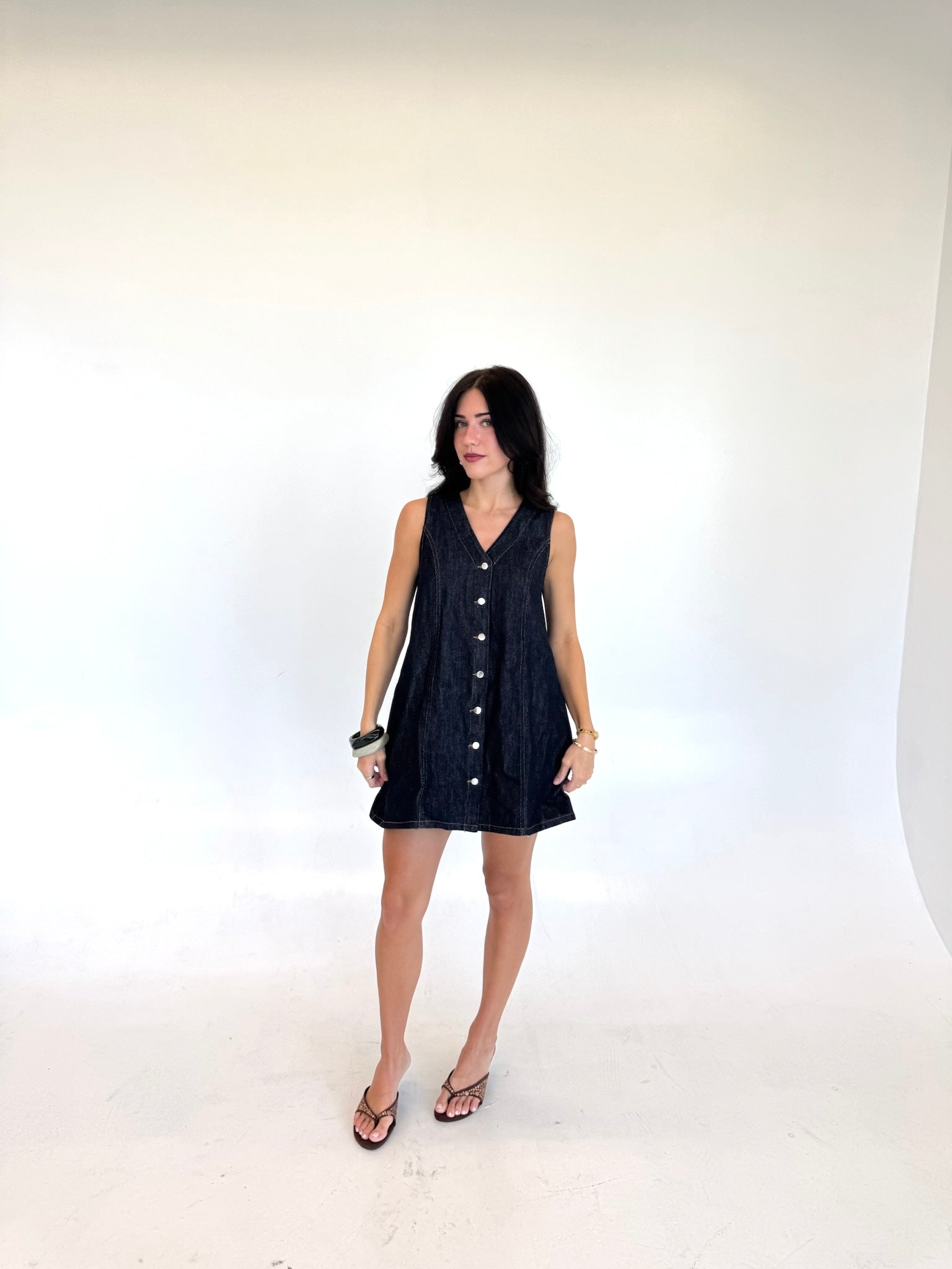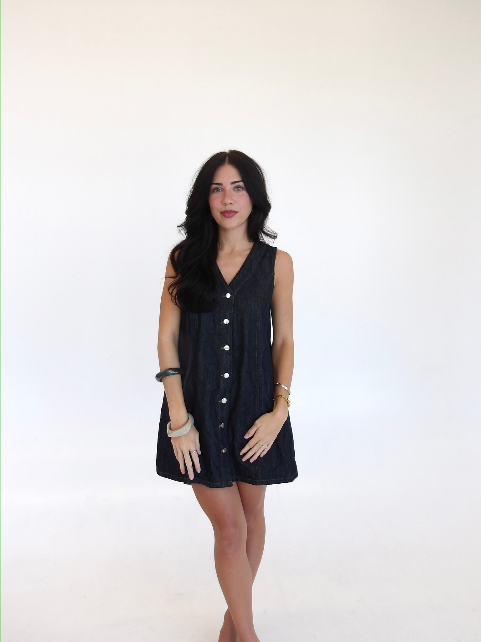 A dark washed denim dress with buttons along. The easiest Summer to Fall transition you've ever seen with hint of a forever denim classic!