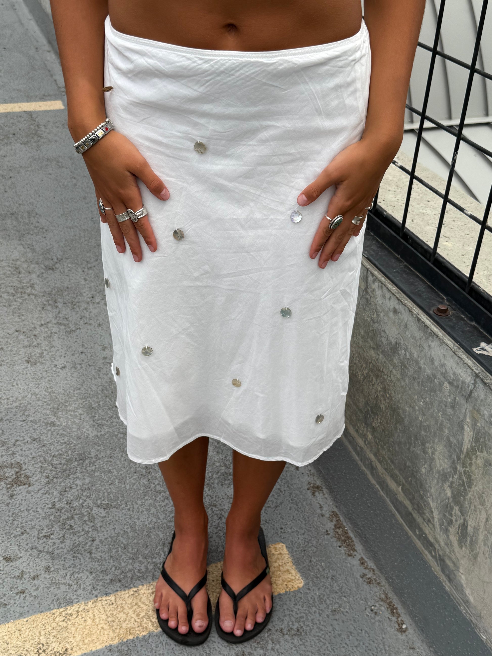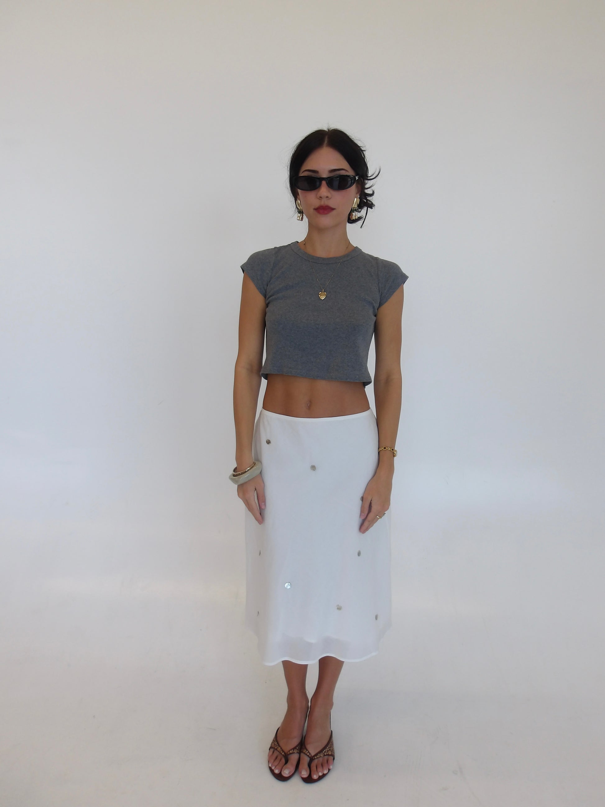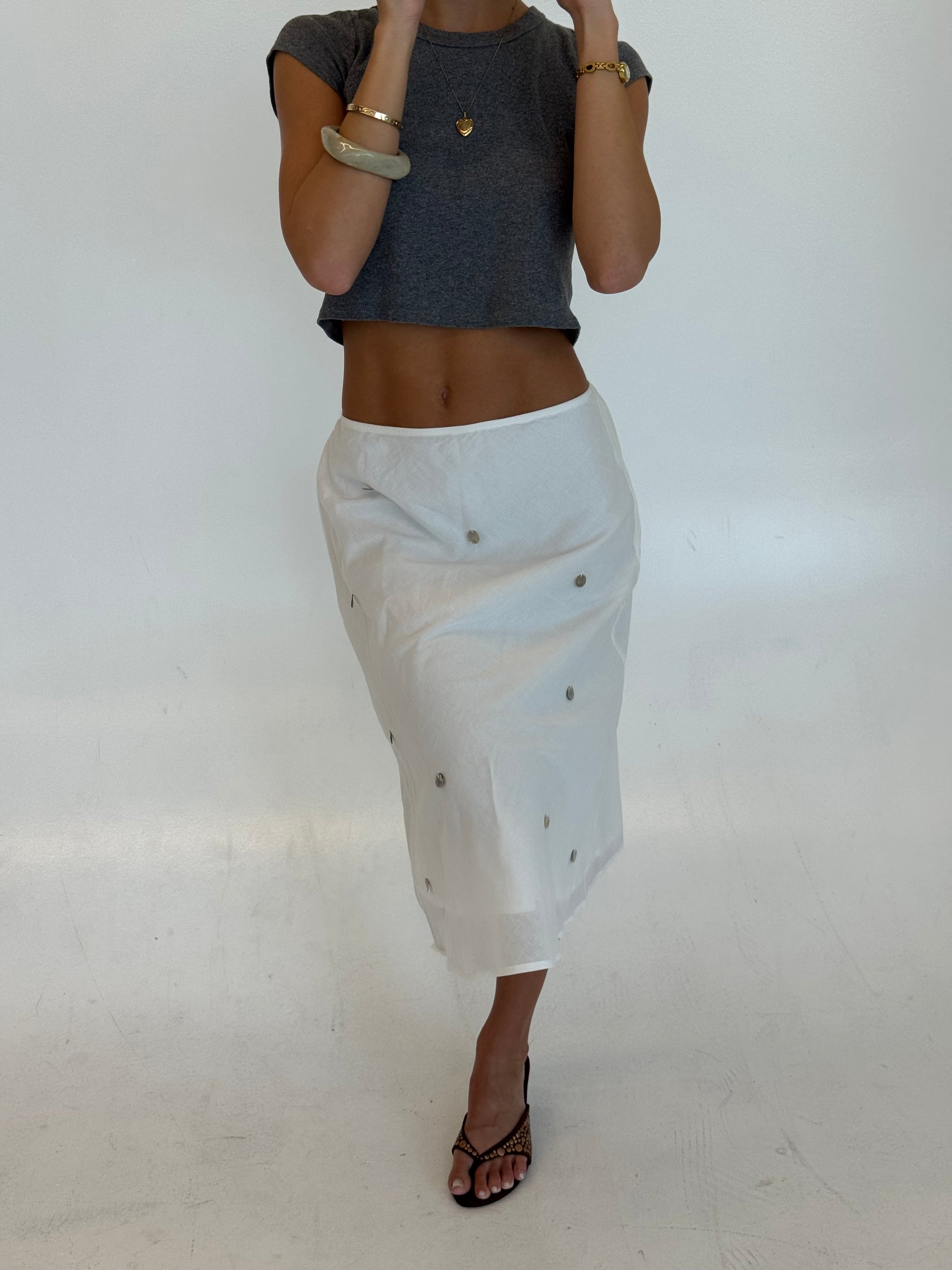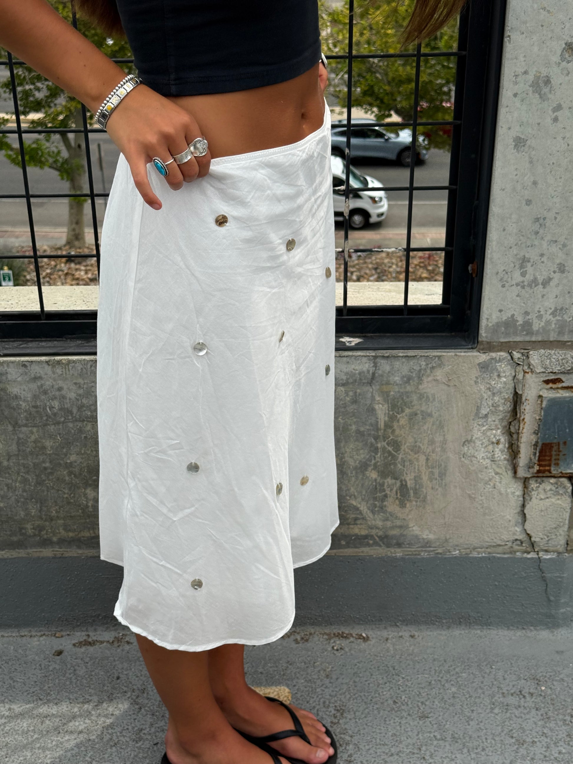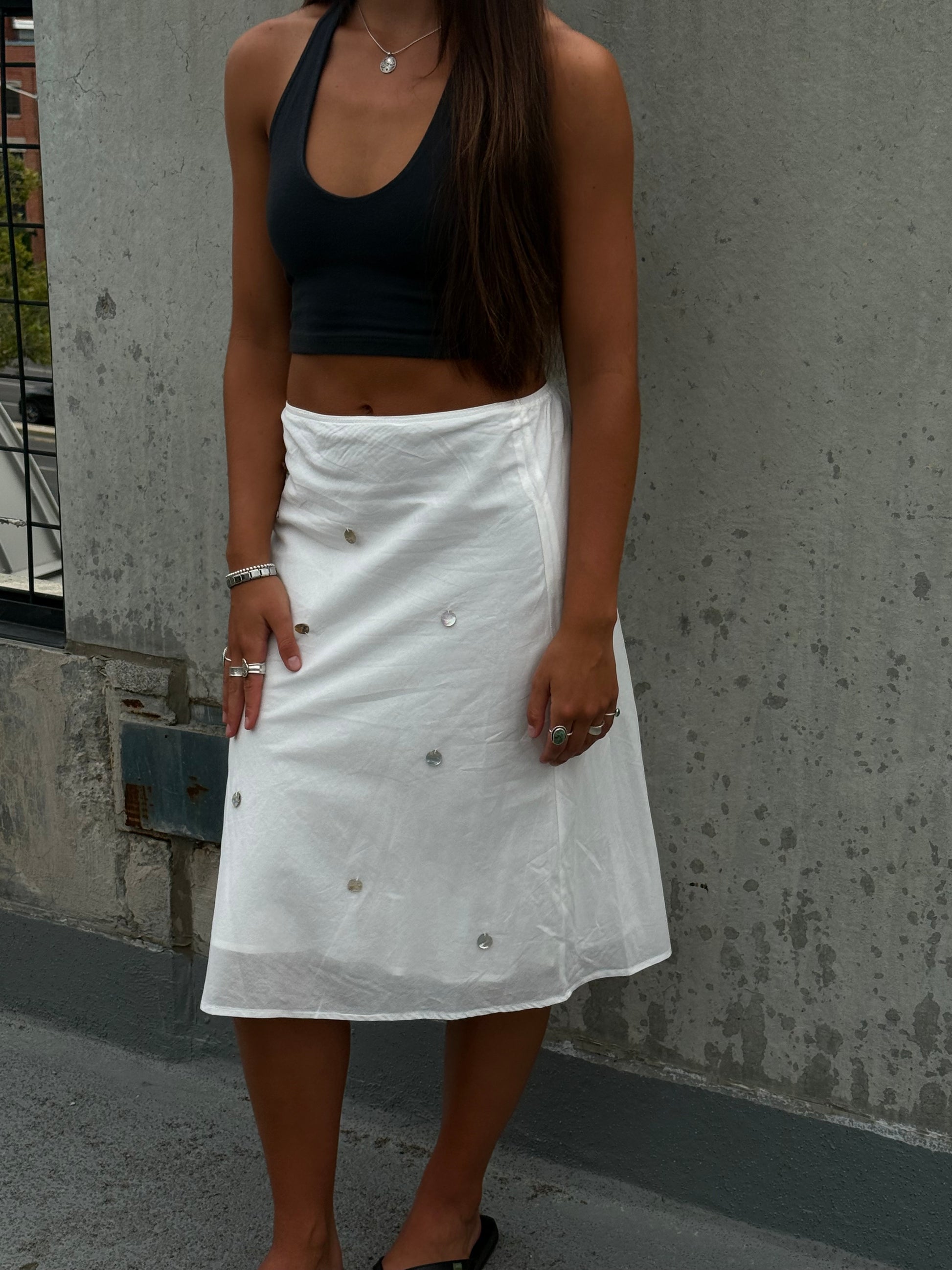 We've been inspired everywhere with the midi skirt look. We wanted to bring something unique to it. Flat shells attached with a flowy sheer lining. The easiest piece to play with!