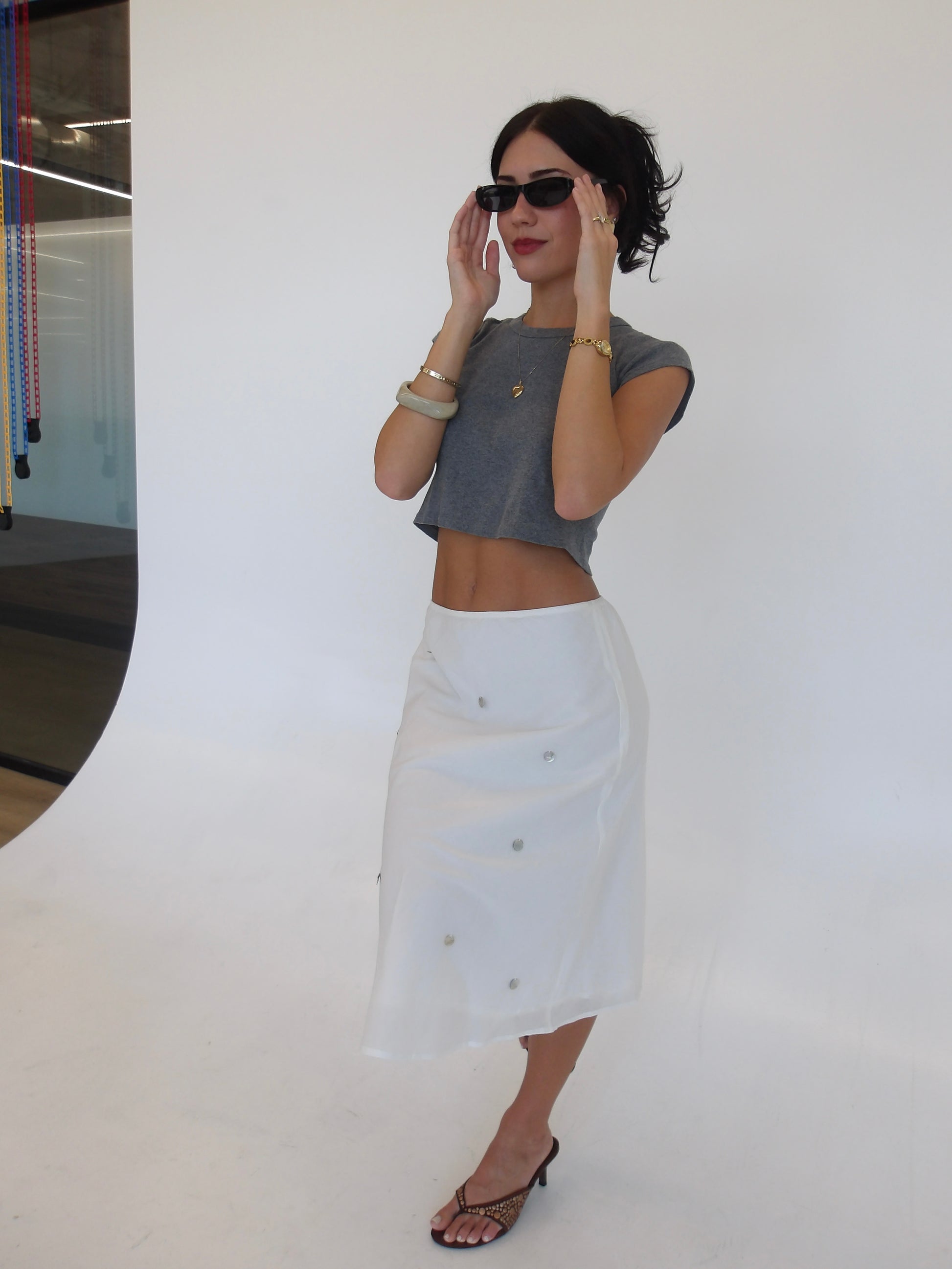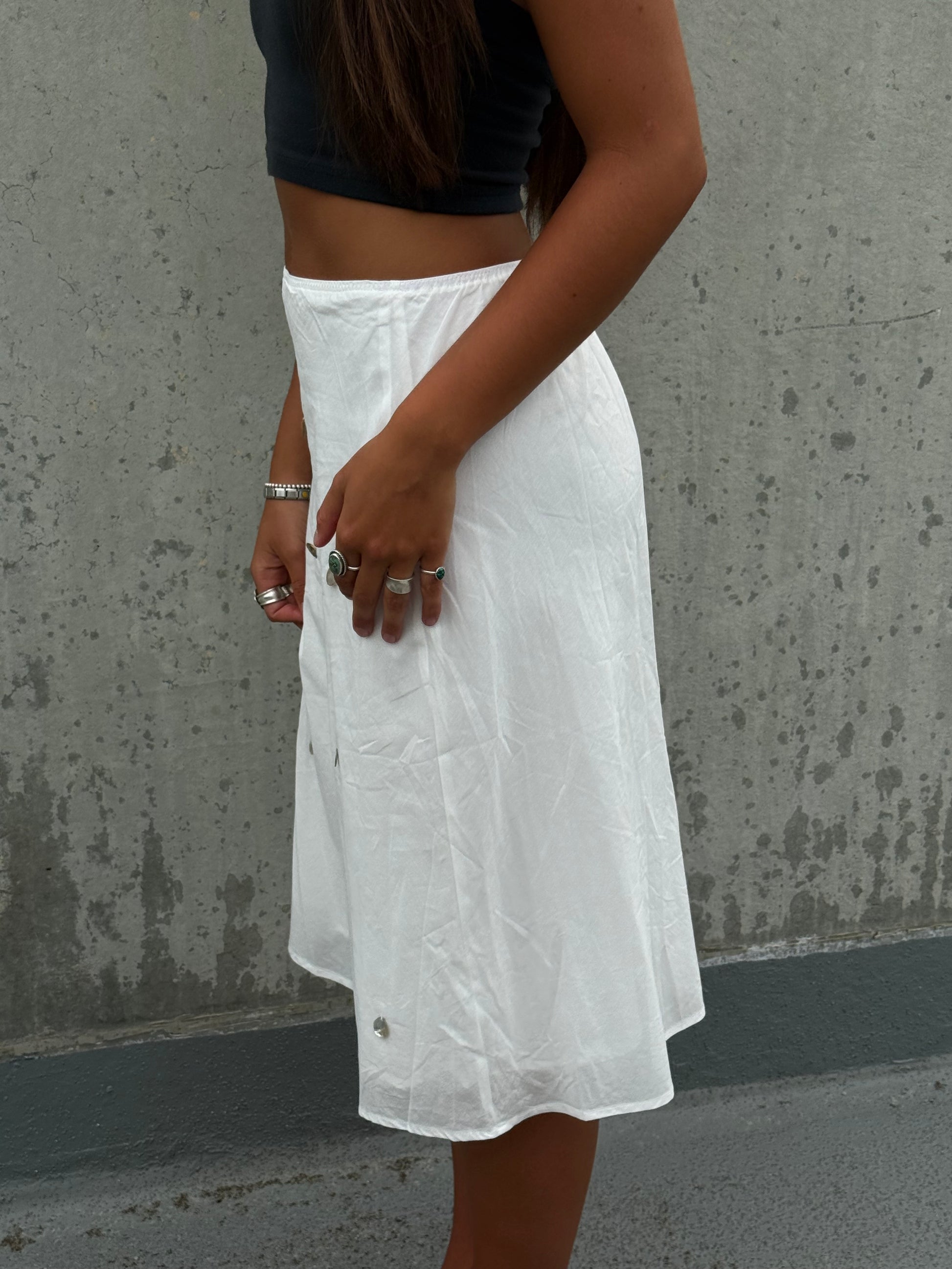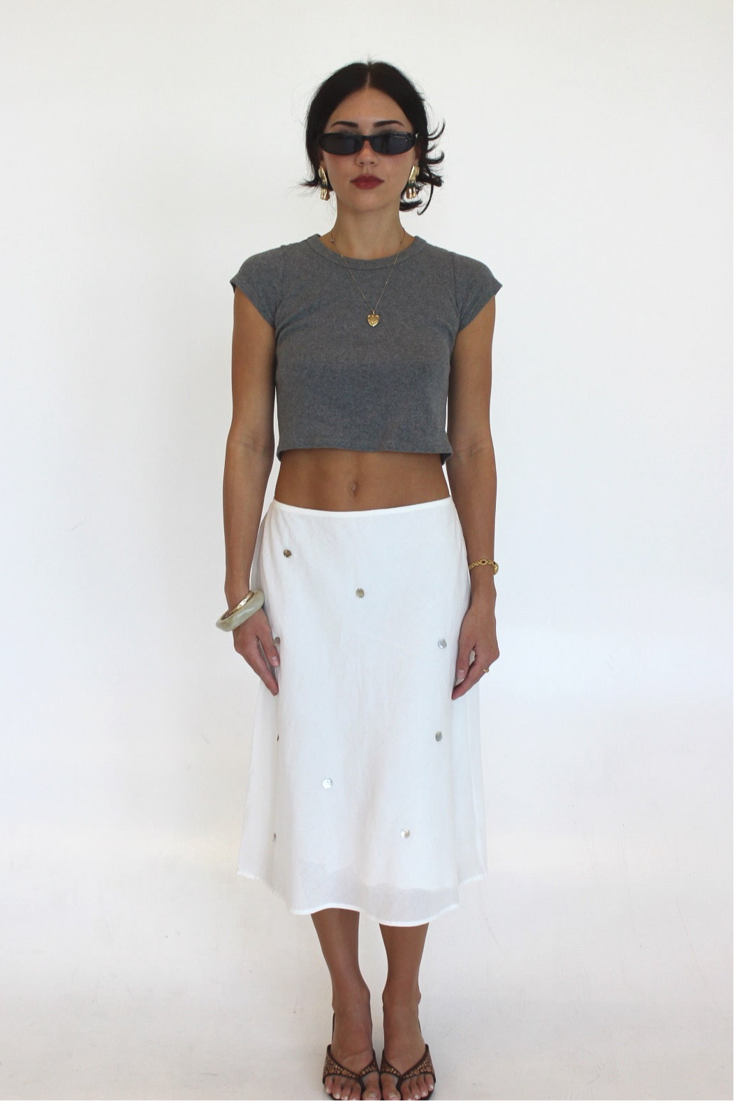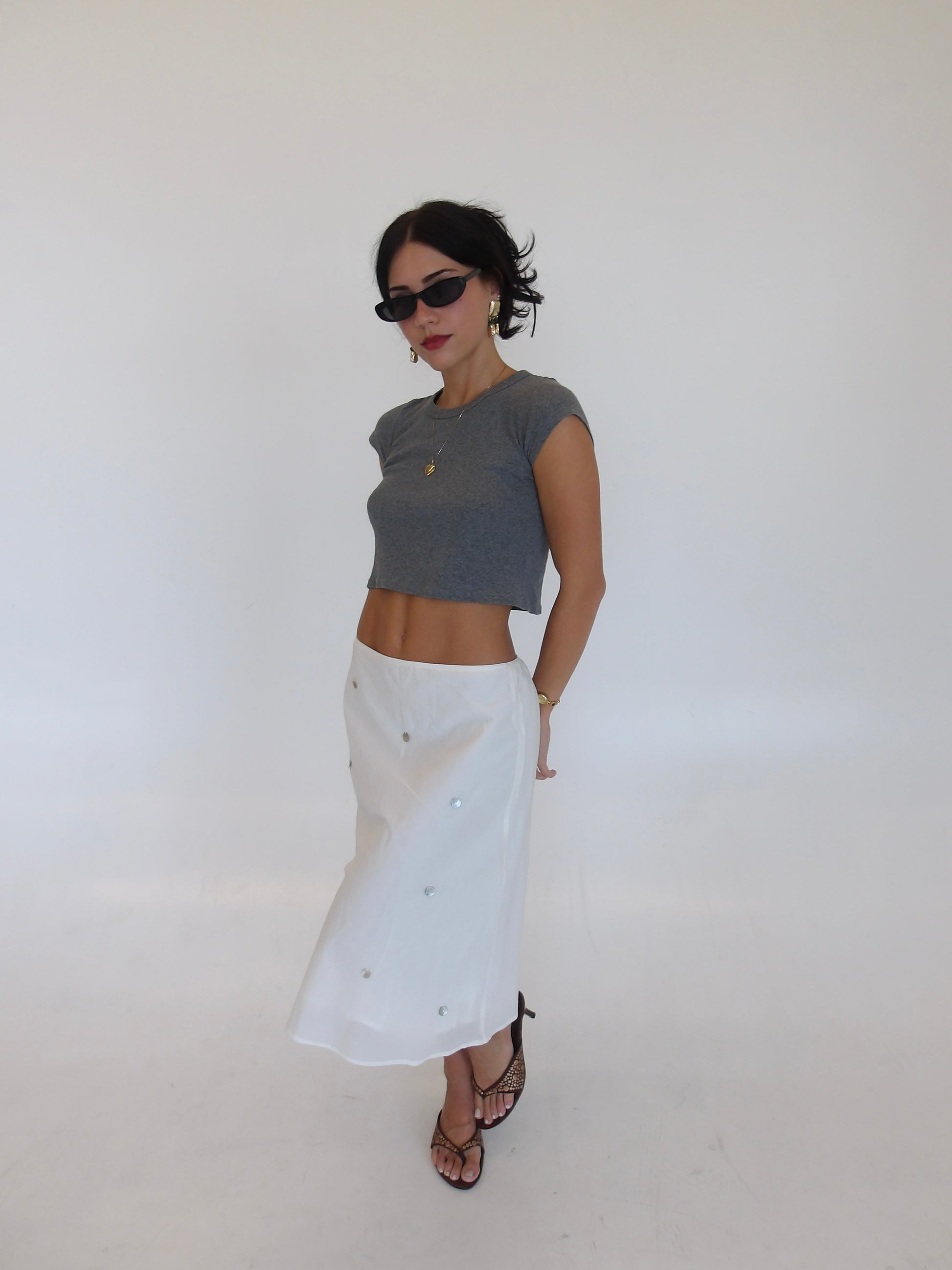 We've been inspired everywhere with the midi skirt look. We wanted to bring something unique to it. Flat shells attached with a flowy sheer lining. The easiest piece to play with!