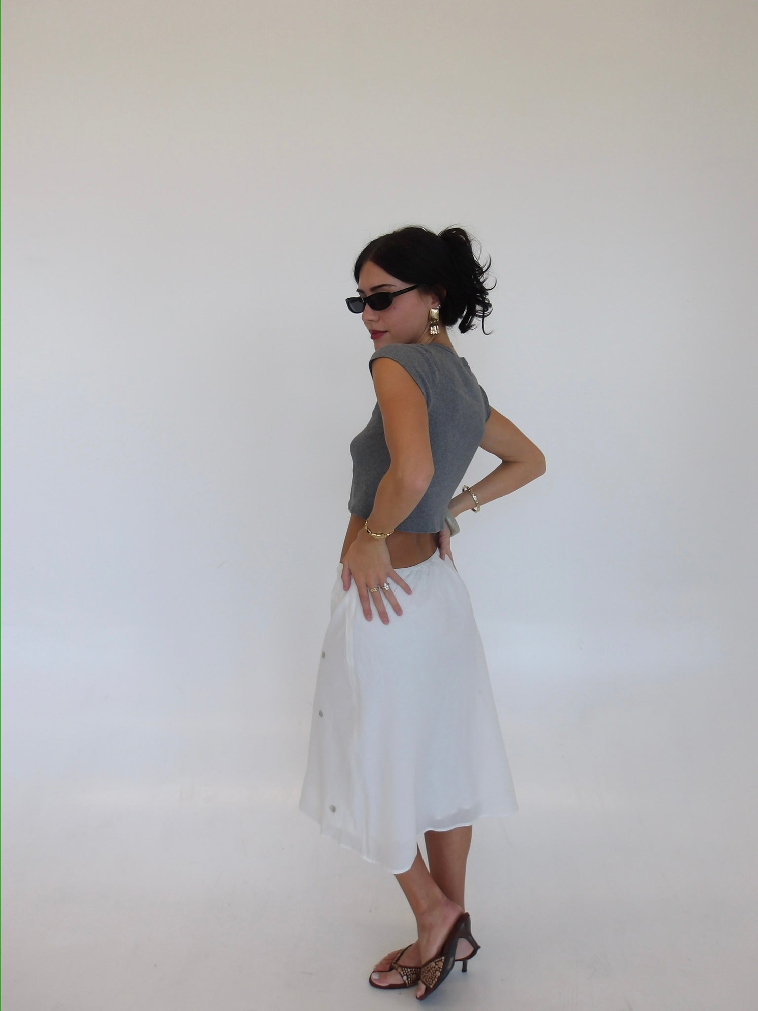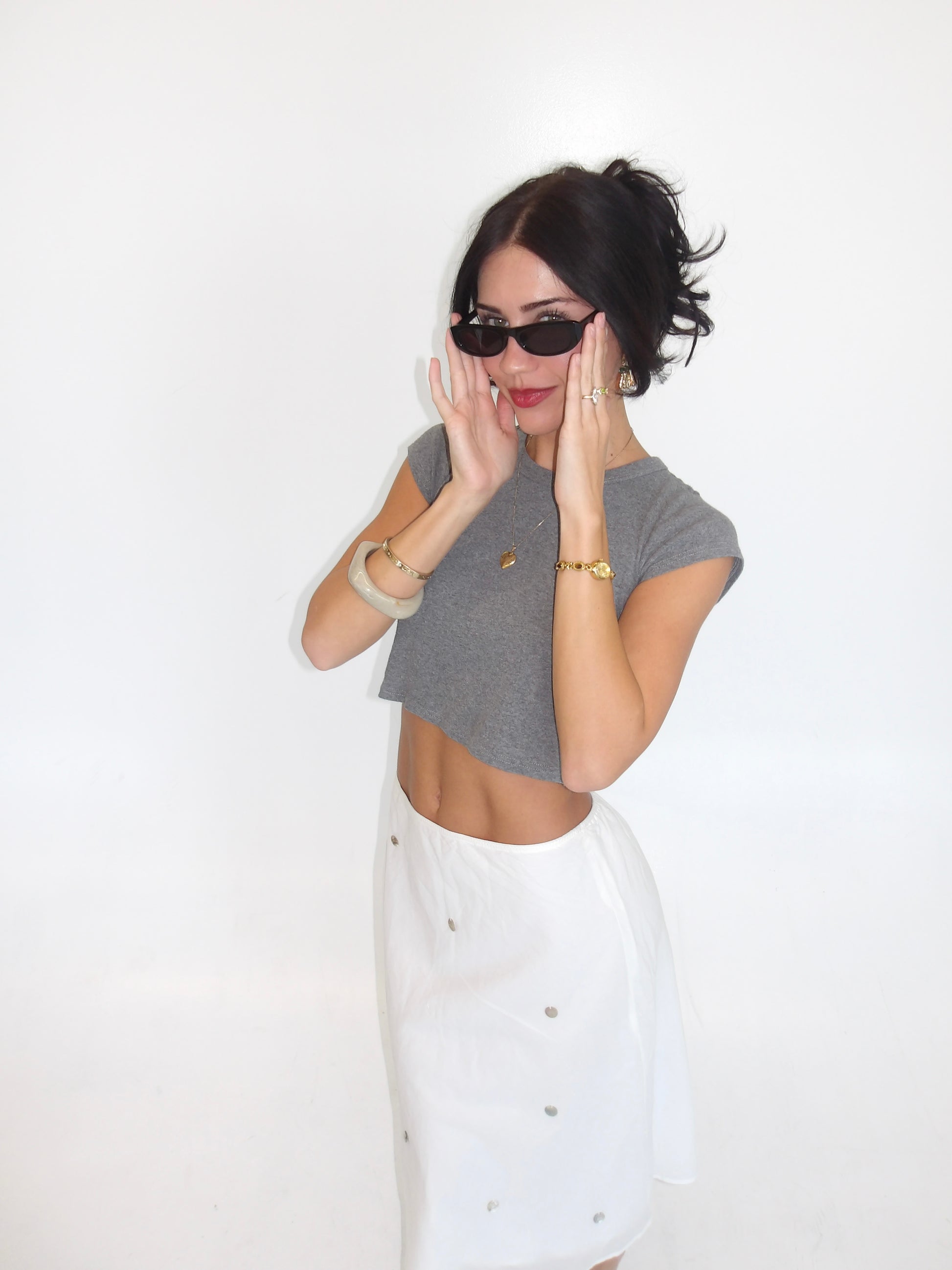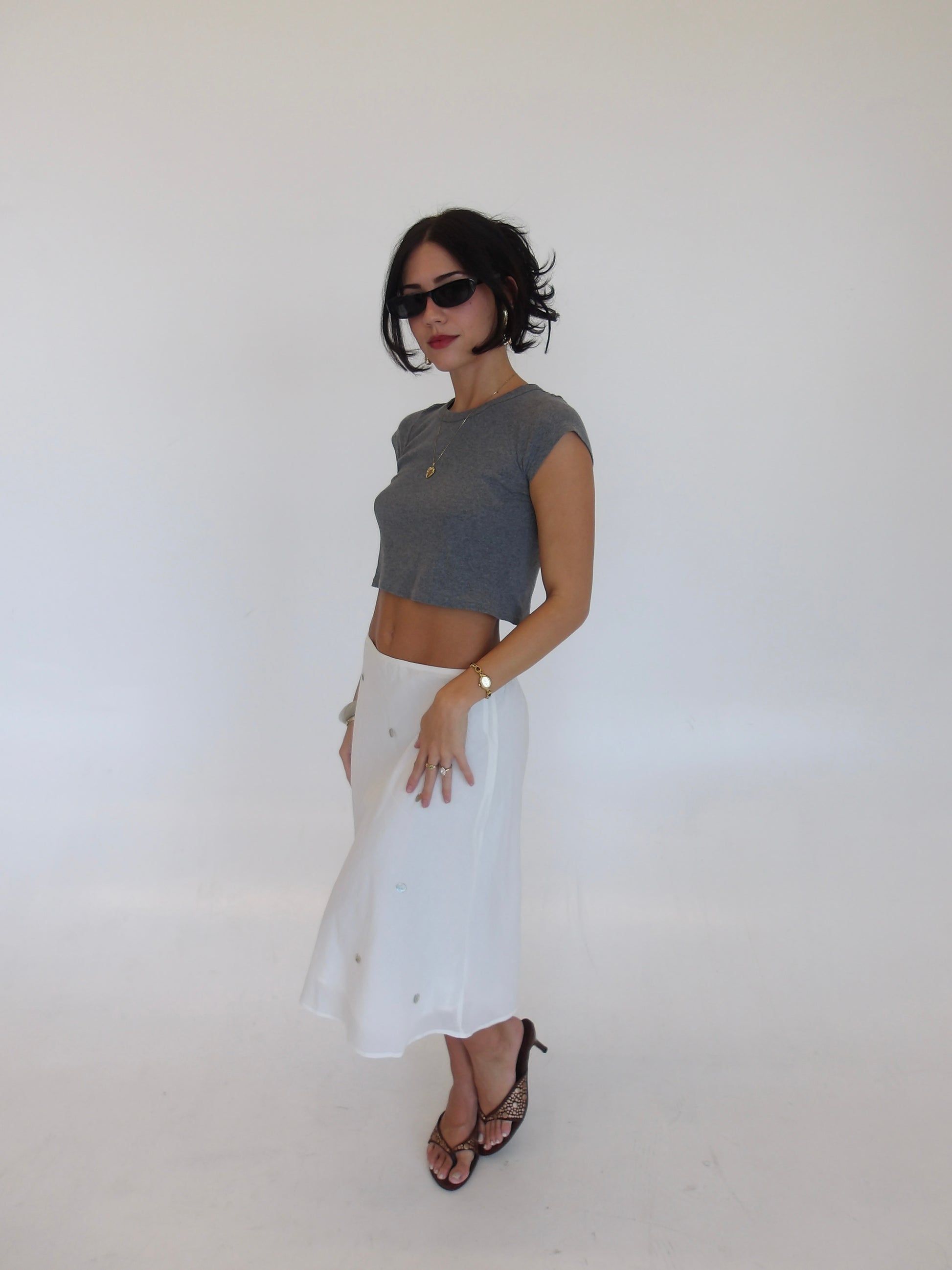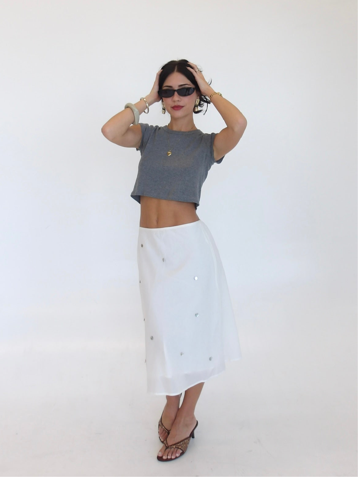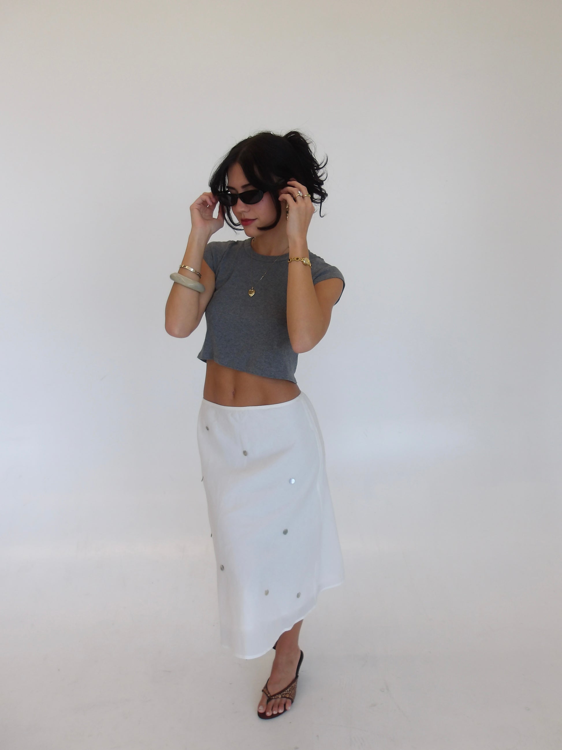 We've been inspired everywhere with the midi skirt look. We wanted to bring something unique to it. Flat shells attached with a flowy sheer lining. The easiest piece to play with!